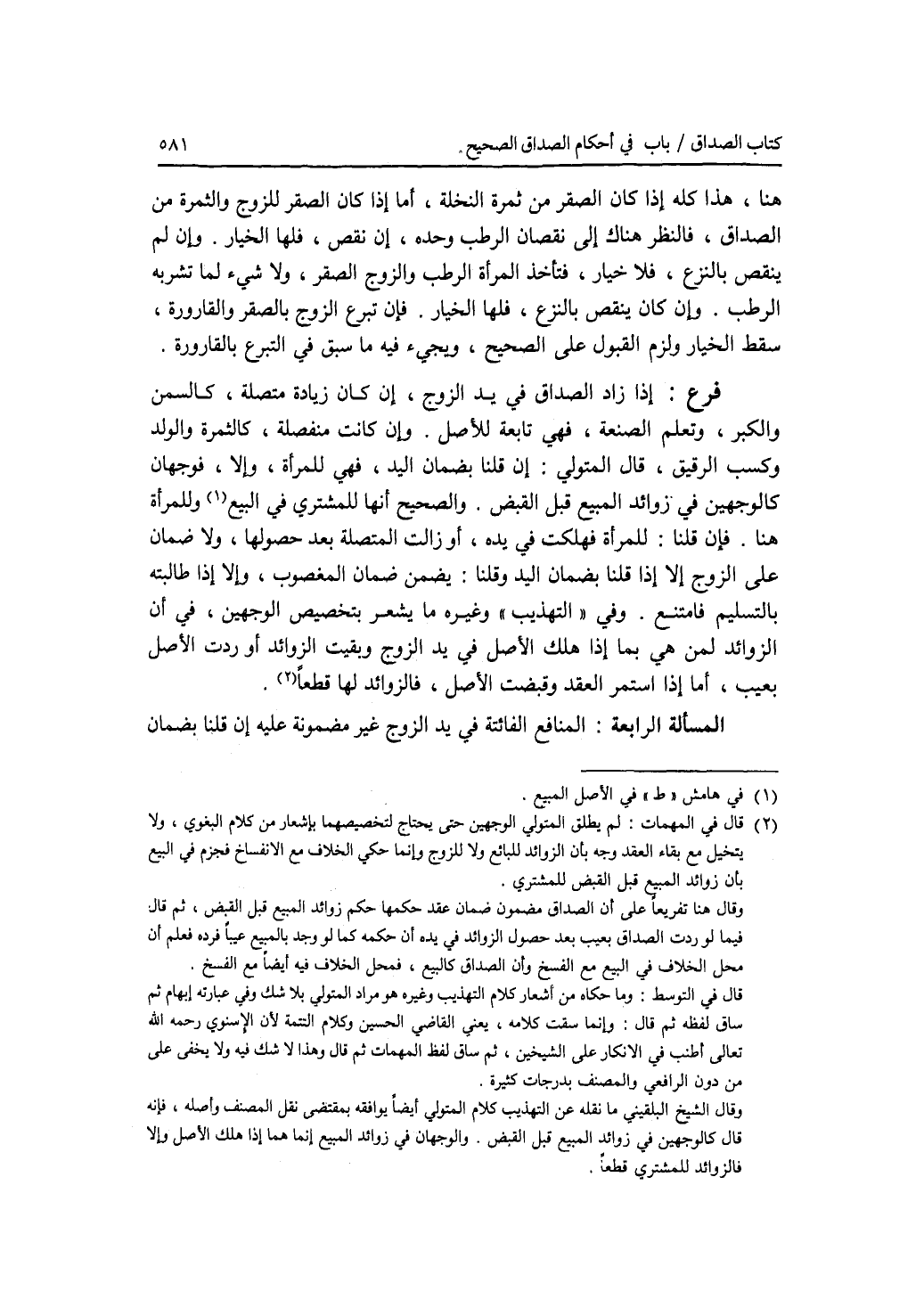 هنا، هذا كله إذا كان الصقر من ثمرة النخلة، أما إذا كان الصقر للزوج والثمرة من الصداق، فالنظر هنا ك إلى نقصان الرطب وحده، إن نقص، فلها الخيار. وإن لم ينقص بالنزع، فلا خيار، فتأخذ المرأة الرطب والزوج الصقر، ولا شئ لما تشربه الرطب. وإن كان ينقص بالنزع، فلها الخيار. فإن تبرع الزوج بالصقر والقارورة، سقط الخيار ولزم القبول على الصحيح، ويجئ فيه ما سبق في التبرع بالقارورة. فرع إذا زاد الصداق في يد الزوج، إن كان زيادة متصلة، كالسمن والكبر، وتعلم الصنعة، فهي تابعة للاصل. وإن كانت منفصلة، كالثمرة والولد وكسب الرقيق، قال المتولي: إن قلنا بضمان اليد، فهي للمرأة، وإلا، فوجهان كالوجهين في زوائد المبيع قبل القبض. والصحيح أنها للمشتري في البيع وللمرأة هنا. فإن قلنا: للمرأة فهلكت في يده، أو زالت المتصلة بعد حصولها، ولا ضمان على الزوج إلا إذا قلنا بضمان اليد وقلنا: يضمن ضمان المغصوب، وإلا إذا طالبته بالتسليم فامتنع. وفي التهذيب وغيره ما يشعر بتخصيص الوجهين، في أن الزوائد لمن هي بما إذا هلك الاصل في يد الزوج وبقيت الزوائد أو ردت الاصل بعيب، أما إذا استمر العقد وقبضت الاصل، فالزوائد لها قطعا. المسألة الرابعة: المنافع الفائتة في يد الزوج غير مضمونة عليه إن قلنا بضمان