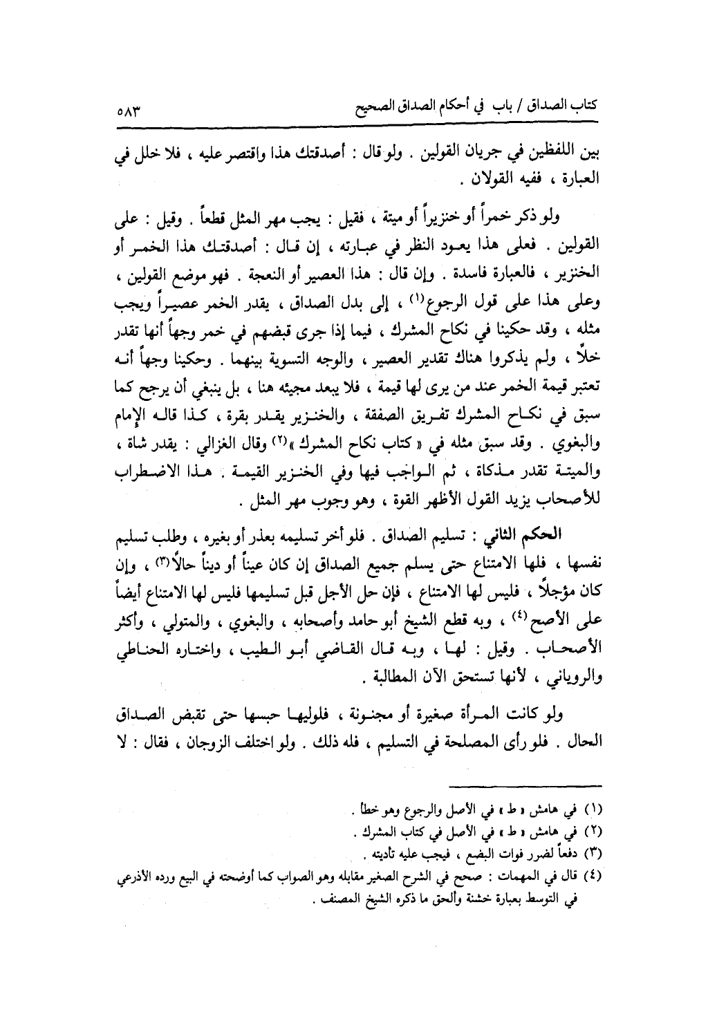 بين اللفظين في جريان القولين. ولو قال: أصدقتك هذا واقتصر عليه، فلا خلل في العبارة، ففيه القولان. ولو ذكر خمرا أو خنزيرا أو ميتة، فقيل: يجب مهر المثل قطعا. وقيل: على القولين. فعلى هذا يعود النظر في عبارته، إن قال: أصدقتك هذا الخمر أو الخنزير، فالعبارة فاسدة. وإن قال: هذا العصير أو النعجة، فهو موضع القولين، وعلى هذا على قول الرجوع إلى بدل الصداق، يقدر الخمر عصيرا ويجب مثله، وقد حكينا في نكاح المشرك، فيما إذا جرى قبضهم في خمر وجها أنها تقدر خلا، ولم يذكروا هناكتقدير العصير، والوجه التسوية بينهما. وحكينا وجها أنه تعتبر قيمة الخمر عن من يرى لها قيمة، فلا يبعد مجيئه هنا، بل ينبغي أن يرجح كما سبق في نكاح المشرك تفريق الصفقة، والخنزير يقدر بقرة، كذا قاله الامام والبغوي. وقد سبق مثله في كتاب نكاح المشرك وقال الغزالي: يقدر شاة، والميتة تقدر مذكاة، ثم الواجب فيها وفي الخنزير القيمة. هذا الاضطراب للاصحاب يزيد القول الاظهر القوة، وهو وجوب مهر المثل.
