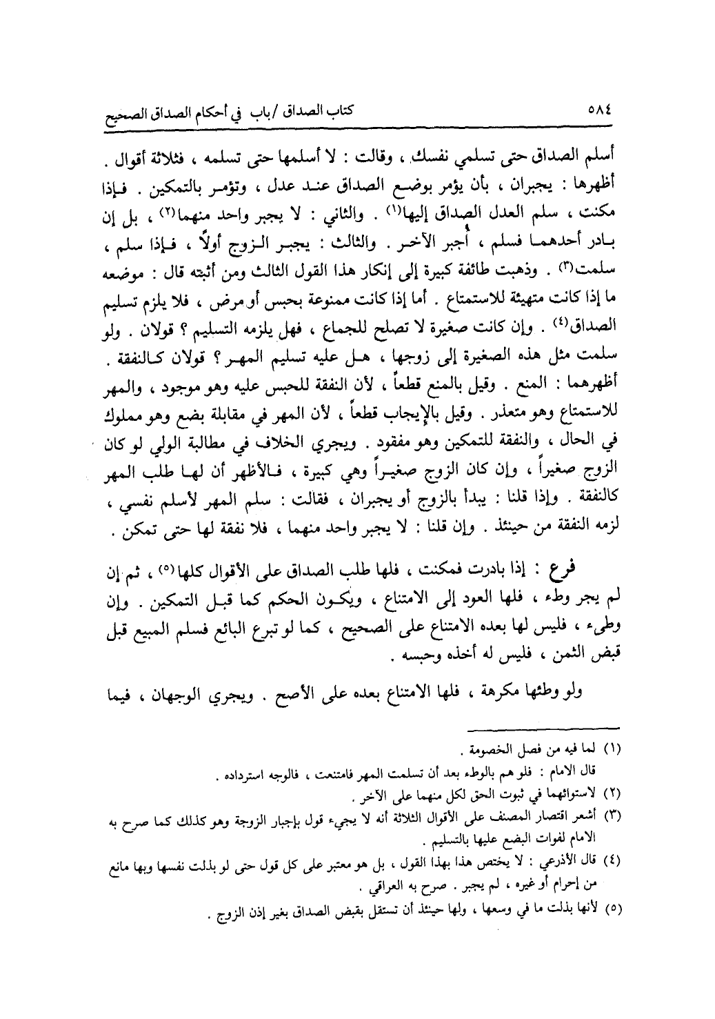 أسلم الصداق حتى تسلمي نفسك، وقالت: لا أسلمها حتى تسلمه، فثلاثة أقوال. أظهرها: يجبران، بأن يؤمر بوضع الصداق عند عدل، وتؤمر بالتمكين. فإذا مكنت، سلم العدل الصداق إليها. والثاني: لا يجبر واحد منهما، بل إن بادر أحدهما فسلم، أجبر الآخر. والثالث: يجبر الزوج أولا، فإذا سلم، سلمت. وذهبت طائفة كبيرة إلى إنكار هذا القول الثالث. ومن أثبته قال: موضعه ما إذا كانت متهيئة للاستمتاع. أما إذا كانت ممنوعة بحبس أو مرض، فلا يلزم تسليم الصداق. وإن كانت صغيرة لا تصلح للجماع، فهل يلزمه التسليم ؟ قولان. ولو سلمت مثل هذه الصغيرة إلى زوجها، هل عليه تسليم المهر ؟ قولان كالنفقة. أظهرهما: المنع. وقيل بالمنع قطعا، لان النفقة للحبس عليه وهو موجود، والمهر للاستمتاع وهو متعذر. وقيل بالايجاب قطعا، لان المهر في مقابلة بضع وهو مملوك في الحال، والنفقة للتمكين وهو مفقود. ويجري الخلاف في مطالبة الولي لو كان الزوج صغيرا، وإن كان الزوج صغيرا وهي كبيرة، فالاظهر أن لها طلب المهر كالنفقة. وإذا قلنا: يبدأ بالزوج أو يجبران، فقالت: سلم المهر لاسلم نفسي، لزمه النفقة من حينئذ. وإن قلنا: لا يجبر واحد منهما، فلا نفقة لها حتى تمكن. فرع إذا بادرت فمكنت، فلها طلب الصداق على الاقوال كلها، ثم إن لم يجر وطئ، فلها العود إلى الامتناع، ويكون الحكم كما قبل التمكين. وإن وطئ، فليس لها بعده الامتناع على الصحيح، كما لو تبرع البائع فسلم المبيع قبل قبض الثمن، فليس له أخذه وحبسه. ولو وطئها مكرهة، فلها الامتناع بعده على الاصح. ويجري الوجهان، فيما