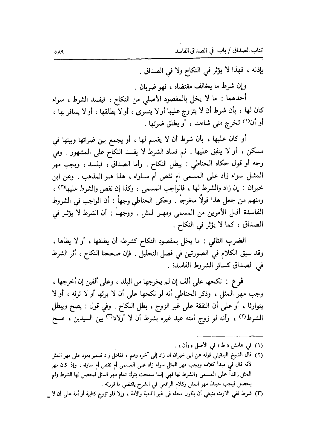 إلا بإذنه، فهذا لا يؤثر في النكاح ولا في الصداق. وإن شرط مايخالف مقتضاه، فهو ضربان. أحدهما: ما لا يخل بالمقصود الاصلي من النكاح، فيفسد الشرط، سواء كان لها، بأن شرط أن لا يتزوج عليها أو لا يتسرى، أو يطلقها، أو لا يسافر بها، أو أن تخرج متى شاءت، أو يطلق ضرتها. أو كان عليها، بأن شرط أن لا يقسم لها، أو يجمع بين ضراتها وبينها في مسكن، أو لا ينفق عليها. ثم فساد الشرط لا يفسد النكاح على المشهور. وفي وجه أو قول حكاه الحناطي: يبطل النكاح. وأما الصداق، فيفسد، ويجب مهر المثل سواء زاد على المسمى أم نقص أم ساواه، هذا هو المذهب. وعن ابن خيران: إن زاد والشرط لها، فالواجب المسمى، وكذا إن نقص والشرط عليها، ومنهم من جعل هذا قولا مخرجا. وحكى الحناطي وجها: أن الواجب في الشروط الفاسدة أقل الامرين من المسمى ومهر المثل. ووجها: أن الشرط لا يؤثر في الصداق، كما لا يؤثر في النكاح. الضرب الثاني: ما يخل بمقصود النكاح كشرطه أن يطلقها، أو لا يطأها، وقد سبق الكلام في الصورتين ففصل التحليل. فإن صححنا النكاح، أثر الشرط في الصداق كسائر الشروط الفاسدة. فرع نكحها على ألف إن لم يخرجها من البلد، وعلى ألفين إن أخرجها، وجب مهر المثل، وذكر الحناطي أنه لو نكحها على أن لا يرثها أو لا ترثه، أو لا يتوارثا، أو على أن النفقة على غير الزوج، بطل النكاح. وفي قول: يصح ويبطل الشرط، وأنه لو زوج أمته عبد غيره بشرط أن لا أولاد بين السيدين، صح