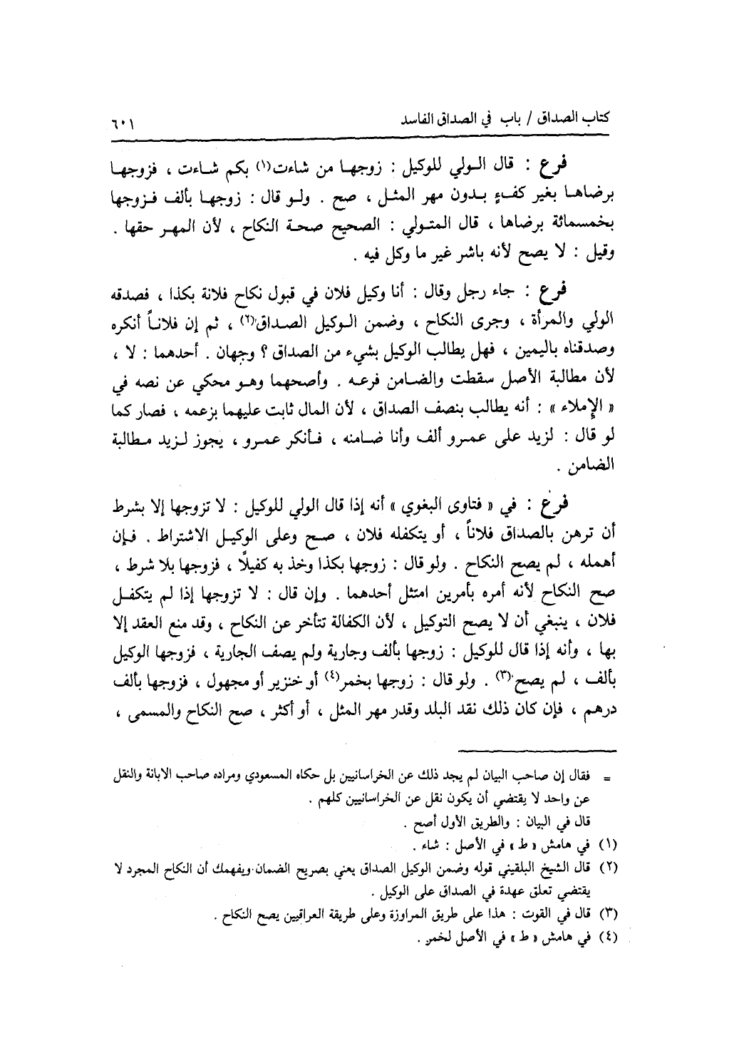 فرع قال الولي للوكيل: زوجها من شاءت بكم شاءت، فزوجها برضاها بغير كف ء بدون مهر المثل، صح. ولو قال: زوجها بألف فزوجها بخمسمائة برضاها، قال المتولي: الصحيح صحة النكاح، لان المهر حقها. وقيل: لا يصح لانه باشر غير ما وكل فيه. فرع جاء رجل وقال: أنا وكيل فلان في قبول نكاح فلانة بكذا، فصدقه الولي والمرأة، وجرى النكاح، وضمن الوكيل الصداق، ثم إن فلانا أنكره وصدقناه باليمين، فهل يطالب الوكيل بشئ من الصداق ؟ وجهان. أحدهما: لا، لان مطالبة الاصل سقطت والضامن فرعه. وأصحهما وهو محكي عن نصه في الاملاء: أنه يطالب بنصف الصداق، لان المال ثابت عليهما بزعمه، فصار كما لو قال: لزيد على عمرو ألف وأنا ضامنة، فأنكر عمرو، يجوز لزيد مطالبة الضامن. فرع في فتاوى البغوي أنه إذا قال الولي للوكيل: لا تزوجها إلا بشرط أن ترهن بالصداق فلانا، أو يتكفله فلان، صح وعلى الوكيل الاشتراط. فإن أهمله، لم يصح النكاح. ولو قال: زوجها بكذا وخذ به كفيلا، فزوجها بلا شرط، صح النكاح لانه أمره بأمرين امتثل أحدهما. وإن قال: لا تزوجها إذا لم يتكفل فلان، ينبغي أن لا يصح التوكيل، لان الكفالة تتأخر عن النكاح، وقد منع العقد إلا بها، وأنه إذا قال للوكيل: زوجها بألف وجارية ولم يصف الجارية، فزوجها الوكيل بألف، لم يصح. ولو قال: زوجها بخمر أو خنزير أو مجهول، فزوجها بألف درهم، فإن كان ذلك نقد البلد وقدر مهر المثل، أو أكثر، صح النكاح والمسمى،