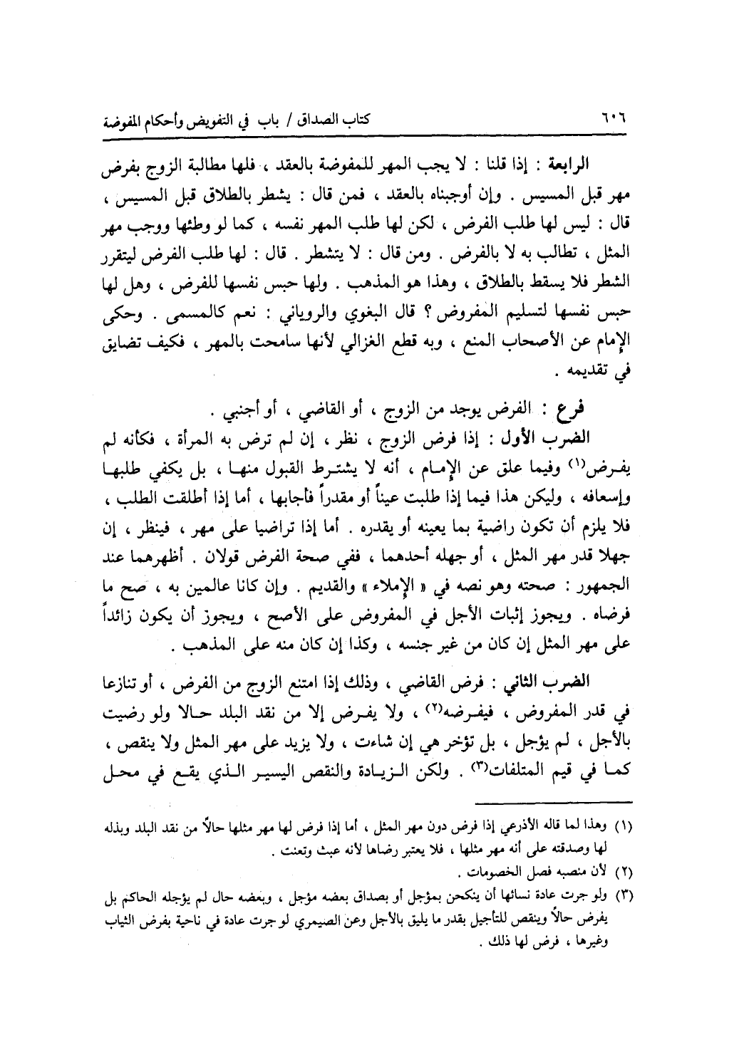 الرابعة: إذا قلنا: لا يجب المهر للمفوضة بالعقد، فلها مطالبة الزوج بفرض مهر قبل المسيس. وإن أوجبناه بالعقد، فمن قال: يشطر بالطلاق قبل المسيس، قال: ليس لها طلب الفرض، لكن لها طلب المهر نفسه، كما لو وطئها ووجب مهر المثل، تطالب به لا بالفرض. ومن قال: لا يتشطر. قال: لها طلب الفرض ليتقرر الشطر فلا يسقط بالطلاق، وهذا هو المذهب. ولها حبس نفسها للفرض، وهل لها حبس نفسها لتسليم المفروض ؟ قال البغوي والروياني: نعم كالمسمى: وحكى الامام عن الاصحاب المنع، وبه قطع الغزالي لانها سامحت بالمهر، فكيف تضايق في تقديمه. فرع الفرض يوجد من الزوج، أو القاضي، أو أجنبي. الضرب الاول: إذا فرض الزوج، نظر، إن لم ترض به المرأة، فكأنه لم يفرض وفيما علق عن الامام، أنه لا يشترط القبول منها، بل يكفي طلبها وإسعافه، وليكن هذا فيما إذا طلبت عينا أو مقدرا فأجابها، أما إذا أطلقت الطلب، فلا يلزم أن تكون راضية بما يعينه أو يقدره. أما إذا تراضيا على مهر، فينظر، إن جهلا قدر مهر المثل، أو جهله أحدهما، ففي صحة الفرض قولان. أظهرهما عند الجمهور: صحته وهو نصه في الاملاء والقديم. وإن كانا عالمين به، صح ما فرضاه. ويجوز إثبات الاجل في المفروض على الاصح، ويجوز أن يكون زائدا على مهر المثل إن كان من غير جنسه، وكذا إن كان منه على المذهب. الضرب الثاني: فرض القاضي وذلك إذا امتنع الزوج من الفرض، أو تنازعا في قدر المفروض، فيفرضه، ولا يفرض إلا من نقد البلد حالا. ولو رضيت بالاجل، لم يؤجل، بل تؤخر هي إن شاءت، ولا يزيد على مهر المثل ولا ينقص، كما في قيم المتلفات. ولكن الزيادة والنقص اليسير الذي يقع في محل