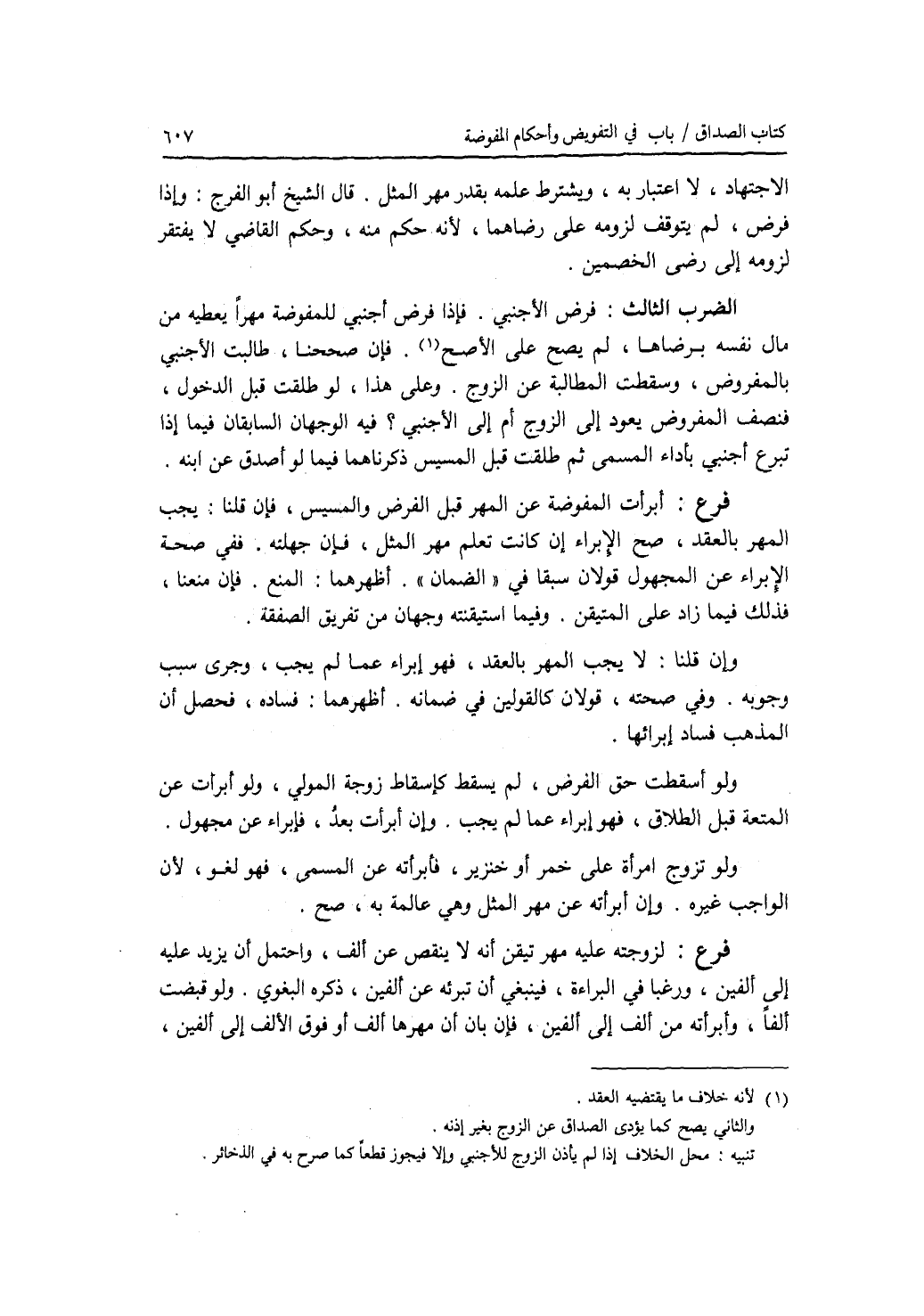 الاجتهاد، لا اعتبار به، ويشترط علمه بقدر مهر المثل. قال الشيخ أبو الفرج: وإذا فرض، لم يتوقف لزومه على رضاهما، لانه حكم منه، وحكم القاضي لا يفتقر لزومه إلى رضى الخصمين. الضرب الثالث: فرض الاجنبي. فإذا فرض أجنبي للمفوضة مهرا يعطيه من مال نفسه برضاها، لم يصح على الاصح. فإن صححنا، طالبت الاجنبي بالمفروض، وسقطت المطالبة عن الزوج. وعلى هذا، لو طلقت قبل الدخول، فنصف المفروض يعود إلى الزوج أم إلى الاجنبي ؟ فيه الوجهان السابقان فيما إذا تبرع أجنبي بأداء المسمى ثم طلقت قبل المسيس ذكرناهما فيما لو أصدق عن ابنه. فرع أبرأت المفوضة عن المهر قبل الفرض والمسيس، فإن قلنا: يجب المهر بالعقد، صح الابراء إن كانت تعلم مهر المثل، فإن جهلته، ففي صحة الابراء عن المجهول قولان سبقا في الضمان. أظهرهما: المنع. فإن منعنا، فذلك فيما زاد على المتيقن. وفيما استيقنته وجهان من تفريق الصفقة. وإن قلنا: يجب المهر بالعقد، فهو إبراء عما لم يجب، وجرى سبب وجوبه. وفي صحته قولان كالقولين في ضمانه. أظهرهما: فساده، فحصل أن المذهب فساد إبرائها. ولو أسقطت حق الفرض، لم يسقط كإسقاط زوجة المولي، ولو أبرأت عن المتعة قبل الطلاق، فهو إبراء عما لم يجب. وإن أبرأت بعد، فإبراء عن مجهول. ولو تزوج امرأة على خمر أو خنزير، فأبرأته عن المسمى، فهو لغو، لان الواجب غيره. وإن أبرأته عن مهر المثل وهي عالمة به، صح. فرع لزوجته عليه مهر تيقن أنه لا ينقص عن ألف، واحتمل أن يزيد عليه إلى ألفين، ورغبا في البراءة، فينبغي أن تبرئه عن ألفين، ذكره البغوي. ولو قبضت ألفا، وأبرأته من ألف إلى ألفين، فإن بان أن مهرها ألف أو فوق الالف إلى ألفين،