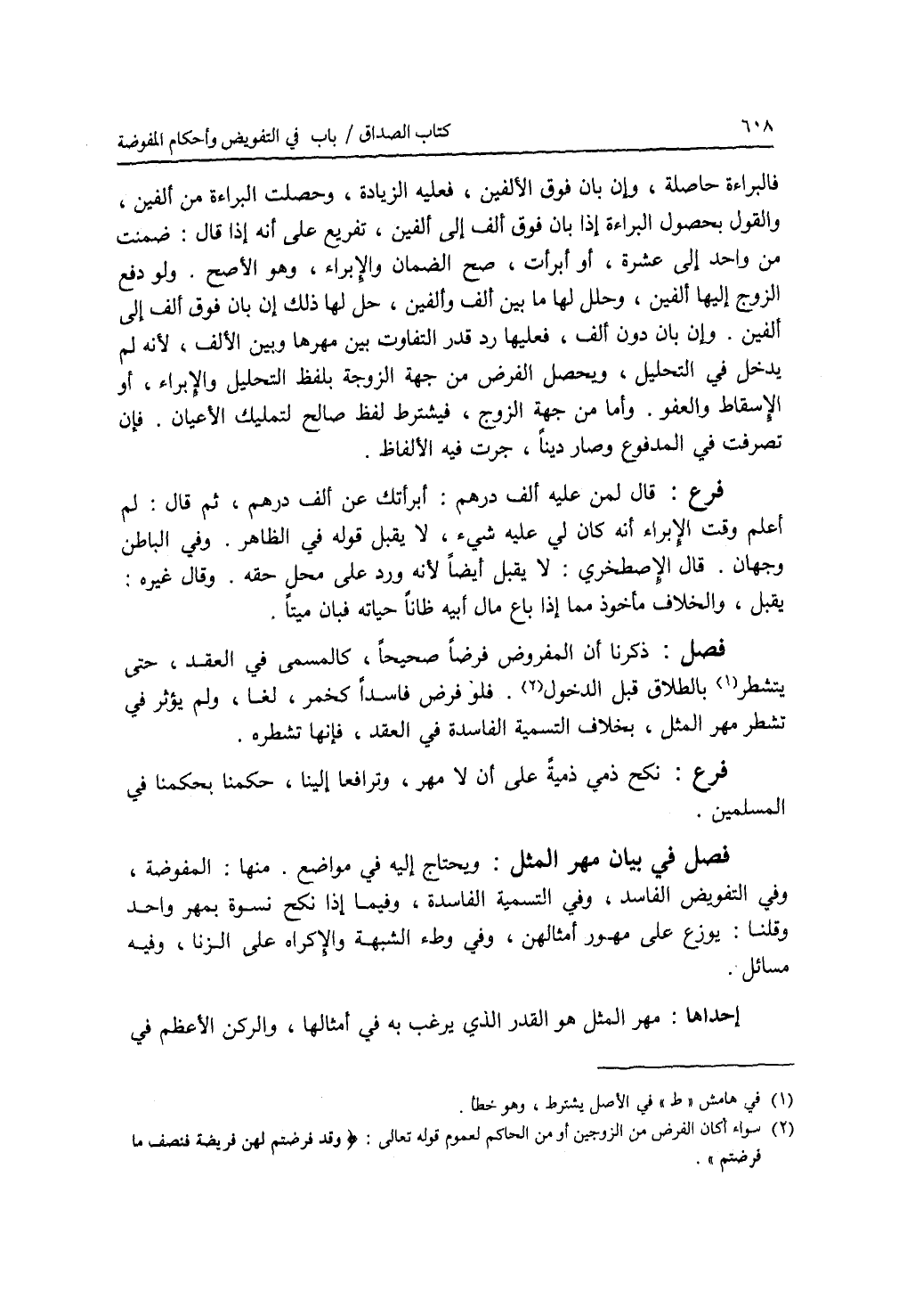 فصل في بيان مهر المثل ويحتاج إليه في مواضع. منها: المفوضة، وفي التفويض الفاسد، وفي التسمية الفاسدة، وفيما إذا نكح نسوة بمهر واحد وقلنا يوزع على مهور أمثالهن، وفي وطئ الشبهة والاكراه على الزنا، وفيه مسائل . إحداها: مهر المثل هو القدر الذي يرغب به في أمثالها، والركن الاعظم في