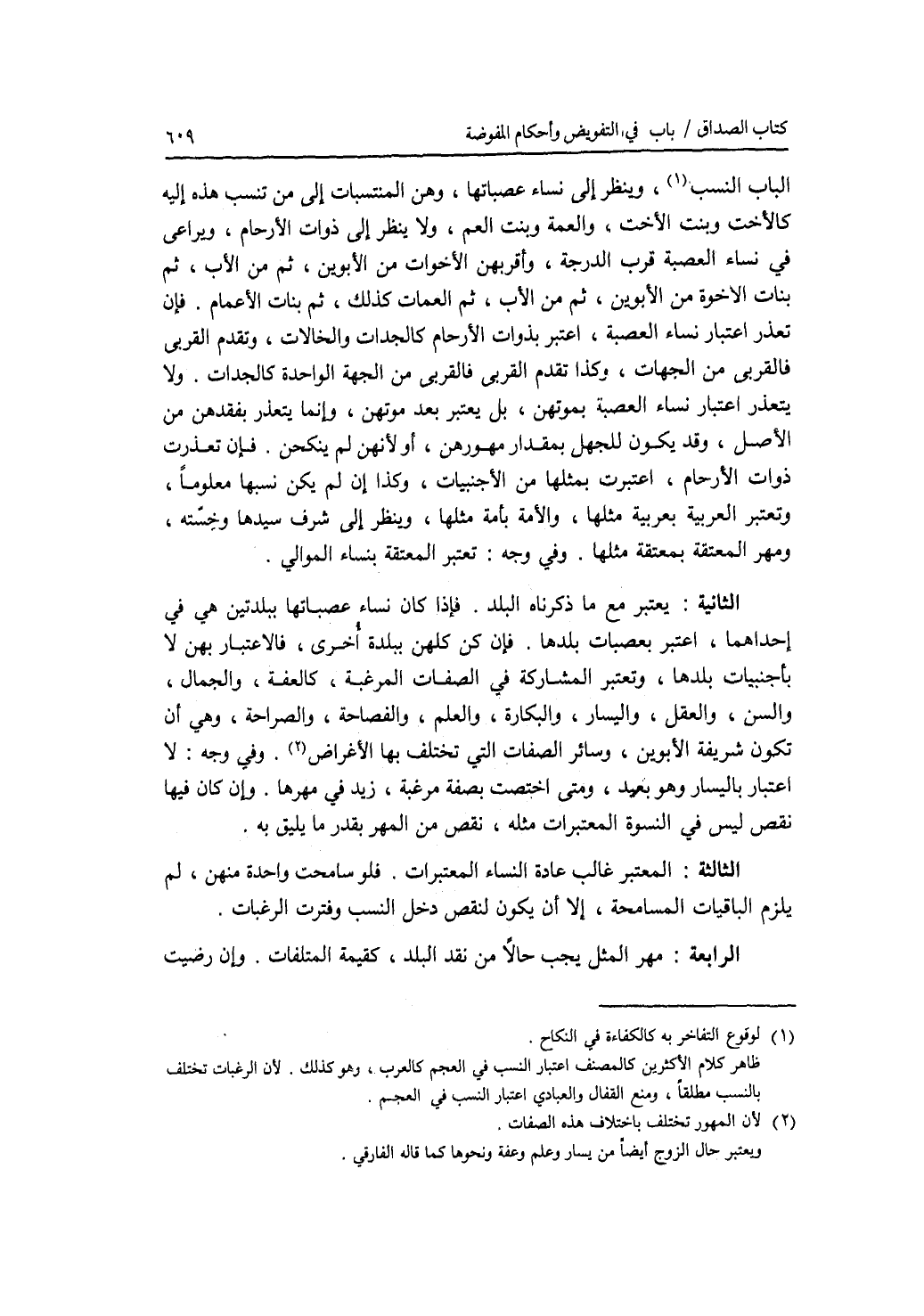 الباب النسب، وينظر إلى نساء عصباتها، وهن المنتسبات إلى من تنسب هذه إليه كالاخت وبنت الاخت، والعمة وبنت العم، ولا ينظر إلى ذوات الارحام، ويراعى في نساء العصبة قرب الدرجة، وأقربهن الاخوات من الابوين، ثم من الاب، ثم بنات الاخوة من الابوين، ثم من الاب، ثم العمات كذلك، ثم بنات الاعمام. فإن تعذر اعتبار نساء العصبة، اعتبر بذوات الارحام كالجدات والخالات، وتقدم القربى فالقربى من الجهات، وكذا تقدم القربى فالقربى من الجهة الواحدة كالجدات. ولا يتعذر اعتبار نساء العصبة بموتهن، بل يعتبر بعد موتهن، وإنما يتعذر بفقدهن من الاصل، وقد يكون للجهل بمقدار مهورهن، أو لانهن لم ينكحن. فإن تعذرت ذوات الارحام، اعتبرت بمثلها من الاجنبيات، وكذا إن لم يكن نسبها معلوما، وتعتبر العربية بعربية مثلها، والامة بأمة مثلها، وينظر إلى شرف سيدها وخسته، ومهر المعتقة بمعتقة مثلها. وفي وجه: تعتبر المعتقة بنساء الموالي. الثانية: يعتبر مع ما ذكرناه البلد. فإذا كان نساء عصباتها ببلدتين هي في إحداهما، اعتبر بعصبات بلدها. فإن كن كلهن ببلدة أخرى، فالاعتبار بهن لا بأجنبيات بلدها، وتعتبر المشاركة في الصفا ت المرغبة، كالعفة، والجمال، والسن، والعقل، واليسار، والبكارة، والعلم، والفصاحة، والصراحة، وهي أن تكون شريفة الابوين، وسائر الصفات التي تختلف بها الاغراض. وفي وجه: لا اعتبار باليسار وهو بعيد، ومتى اختصت بصفة مرغبة، زيد في مهرها. وإن كان فيها نقص ليس في النسوة المعتبرات مثله، نقص من المهر بقدر ما يليق به. الثالثة: المعتبر غالب عادة النساء المعتبرات. فلو سامحت واحدة منهن، لم يلزم الباقيات المسامحة، إلا أن يكون لنقص دخل النسب وفترت الرغبات. الرابعة: مهر المثل يجب حالا من نقد البلد، كقيمة المتلفات. وإن رضيت