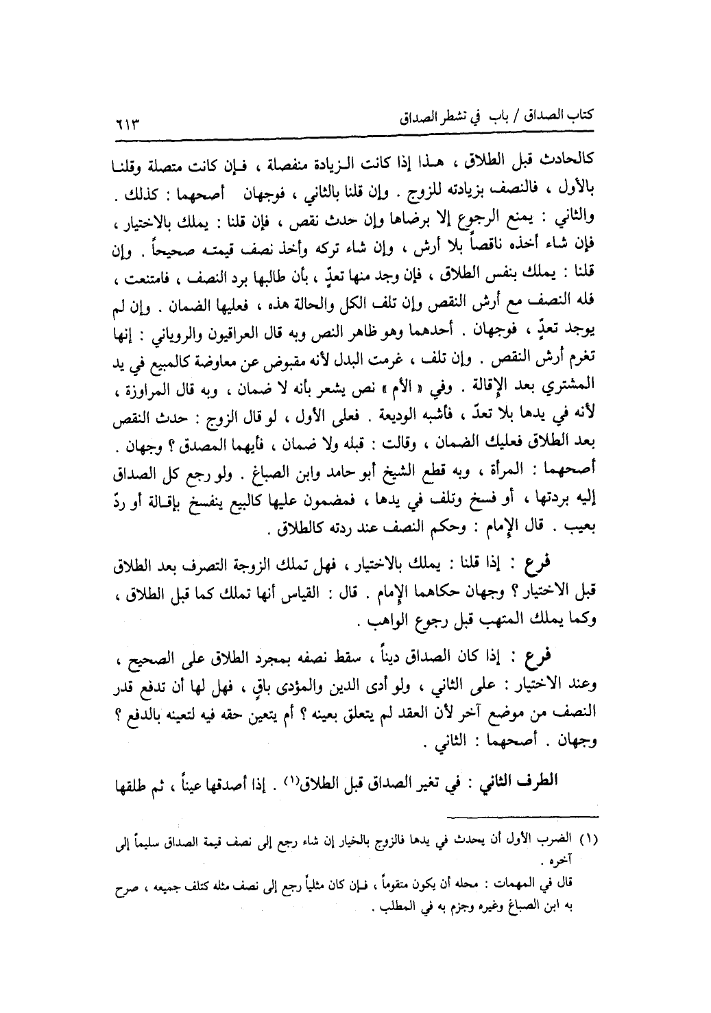 كالحادث قبل الطلاق، هذا إذا كانت الزيادة منفصلة، فإن كانت متصلة وقلنا بالاول، فالنصف بزيادته للزوج. وإن قلنا بالثاني، فوجهان. أصحهما: كذلك. والثاني: يمنع الرجوع إلا برضاها. وإن حدث نقص، فإن قلنا: يملك بالاختيار، فإن شاء أخذه ناقصا بلا أرش، وإن شاتركه وأخذ نصف قيمته صحيحا. وإن قلنا: يملك بنفس الطلاق، فإن وجد منها تعد، بأن طالبها برد النصف، فامتنعت، فله النصف مع أرش النقص وإن تلف الكوالحالة هذه، فعليها الضمان. وإن لم يوجد تعد، فوجهان. أحدهما وهو ظاهر النص وبه قال العراقيون والروياني: أنها تغرم أرش النقص. وإن تلف، غرمت البدل لانه مقبوض عن معاوضة كالمبيع في يد المشتري بعد الاقالة. وفي الام نص يشعر بأنه لا ضمان، وبه قال المراوزة، لانه في يدها بلا تعد، فأشبه الوديعة. فعلى الاول، لو قال الزوج: حدث النقص بعد الطلاق فعليك الضمان، وقالت: قبله ولا ضمان، فأيهما المصدق ؟ وجهان. أصحهما: المرأة، وبه قطع الشيخ أبو حامد وابن الصباغ. ولو رجع كل الصداق إليه بردتها، أو فسخ وتلف في يدها، فمضمون عليها كالبيع ينفسخ بإقالة أو رد بعيب. قال الامام: وحكم النصف عند ردته كالطلاق. فرع إذا قلنا: يملك بالاختيار، فهل تملك الزوجة التصرف بعد الطلاق قبل الاختيار ؟ وجهان حكاهما الامام. قال: القياس أنها تملك كما قبل الطلاق، وكما يملك المتهب قبل رجوع الواهب. فرع إذا كان الصداق دينا، سقط نصفه بمجرد الطلاق على الصحيح، وعند الاختيار: على الثاني، ولو أدى الدين والمؤدى باق، فهل لها أن تدفع قدر النصف من موضع آخر لان العقد لم يتعلق بعينه ؟ أم يتعين حقه فيه لتعينه بالدفع ؟ وجهان. أصحهما الثاني.