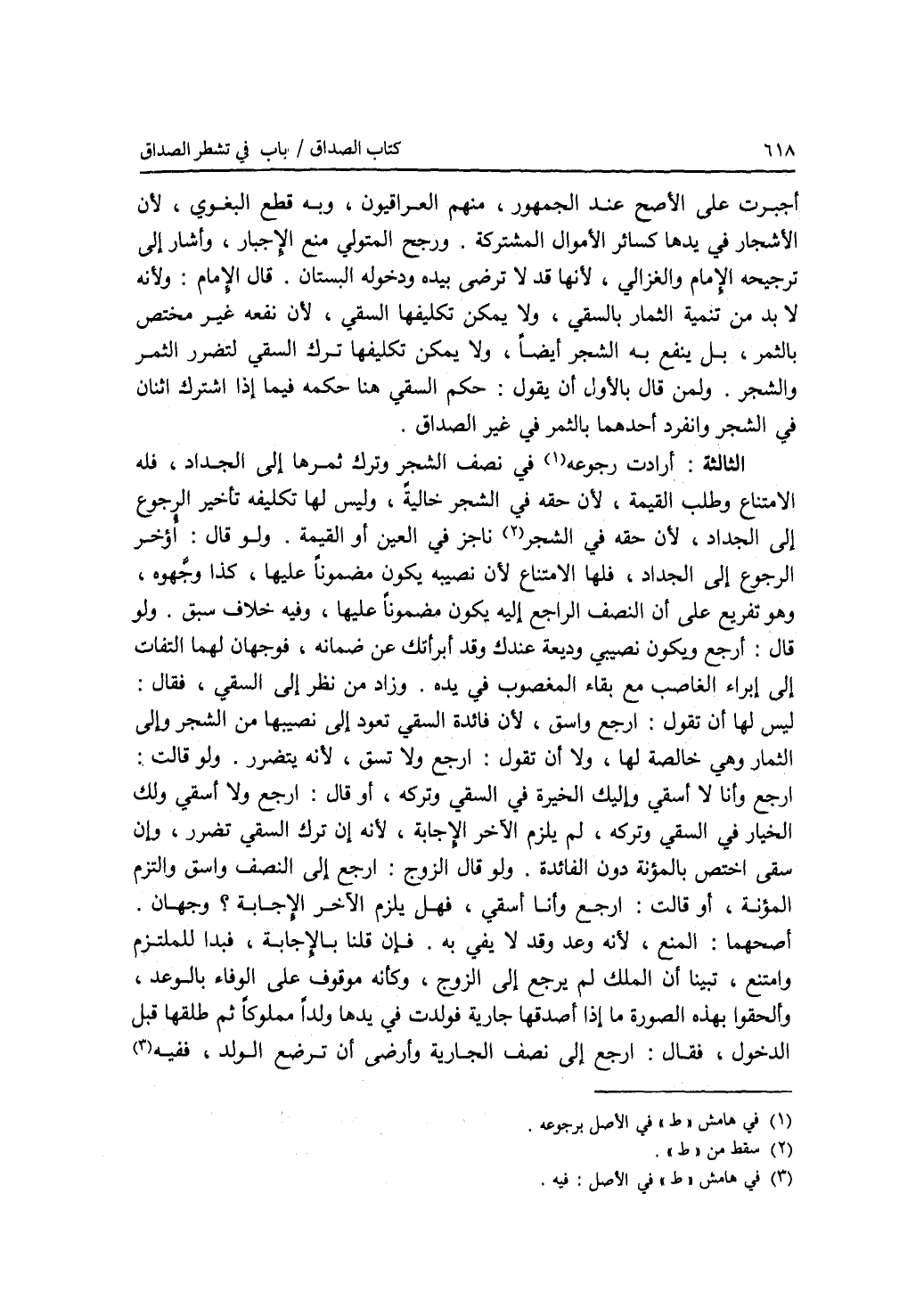 أجبرت على الاصح عند الجمهور، منهم العراقيون، وبه قطع البغوي، لان الاشجار في يدها كسائر الاموال المشتركة. ورجح المتولي منع الاجبار، وأشار إلى ترجيحه الامام والغزالي، لانها قد لا ترضى بيده ودخوله البستان. قال الامام: ولانه لا بد من تنمية الثمار بالسقي، ولا يمكن تكليفها السقي، لان نفعه غير مختص بالثمر، بل ينفع به الشجر أيضا، ولا يمكن تكليفها ترك السقي لتضرر الثمر والشجر. ولمن قال بالاول أن يقول: حكم السقي هنا حكمه فيما إذا اشترك اثنان في الشجر وانفرد أحدهما بالثمر في غير الصداق. الثالثة: أرادت رجوعه في نصف الشجر وترك ثمرها إلى الجداد، فله الامتناع وطلب القيمة، لان حقه في الشجر خالية، وليس لها تكليفه تأخير الرجوع إلى الجداد، لان حقه ناجز في العين أو القيمة. ولو قال: أؤخر الرجوع إلى الجداد، فلها الامتناع لان نصيبه يكون مضمونا عليها، كذا وجهوه، وهو تفريع على أن النصف الراجع إليه يكون مضمونا عليها، وفيه خلاف سبق. ولو قال: أرجع ويكون نصيبي وديعة عندك وقد أبرأتك عن ضمانه، فوجهان لهما التفات إلى حبراء الغاصب مع بقاء المغصوب في يده. وزاد من نظر إلى السقي، فقال: ليس لها أن تقول: ارجع واسق، لان فائدة السقي تعود إلى نصيبها من الشجر وإلى الثمار وهي خالصة لها، ولا أن تقول: ارجع ولا تسق، لانه يتضرر. ولو قالت: ارجع وأنا لا أسقي وإليك الخيرة في السقي وتركه، أو قال: ارجع ولا أسقي ولك الخيار في السقي وتركه، لم يلزم الآخر الاجابة، لانه إن ترك السقي تضرر، وإن سقى اختص بالمؤنة دون الفائدة. ولو قال الزوج: ارجع إلى النصف واسق والتزم المؤنة، أو قالت: ارجع وأنا أسقي، فهل يلزم الآخر الاجابة ؟ وجهان. أصحهما: المنع، لا نوعد وقد لا يفي به. فإن قلنا بالاجابة، فبدا للملتزم وامتنع، تبينا أن الملك لم يرجع إلى الزوج، وكأنه موقوف على الوفاء بالوعد، وألحقوا بهذه الصورة ما إذا أصدقها جارية فولدت في يدها ولدا مملوكا ثم طلقها قبل الدخول، فقال: إرجع إلى نصف الجارية وأرضى أن ترضع الولد، ففيه