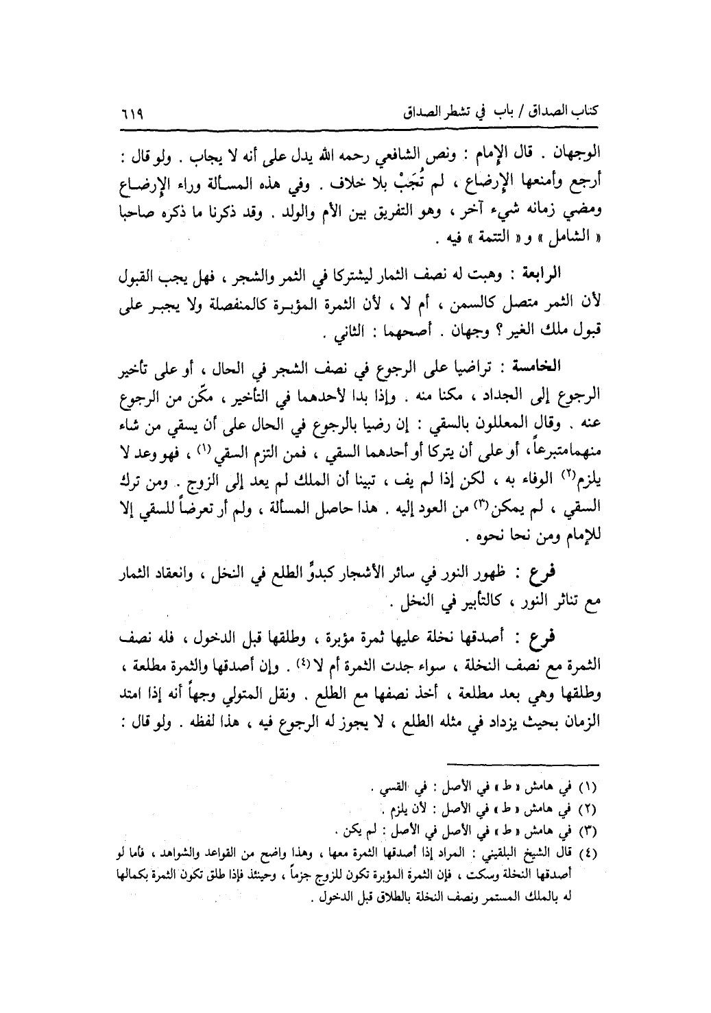 الوجهان. قال الامام: ونص الشافعي رحمه الله يدل على أنه لا يجاب. ولو قال: أرجع وأمنعها الارضاع، لم تجب بلا خلاف. وفي هذه المسألة وراء الارضاع ومضي زمانه شئ آخر، وهو التفريق بين الام والولد. وقد ذكرنا ما ذكره صاحبا الشامل والتتمة فيه. الرابعة: وهبت له نصف الثمار ليشتركا في الثمر والشجر، فهل يجب القبول لان الثمر متصل كالسمن، أم لا، لان الثمرة المؤبرة كالمنفصلة ولا يجبر على قبول ملك الغير ؟ وجهان. أصحهما: الثاني. الخامسة: تراضيا على الرجوع في نصف الشجر في الحال، أو على تأخير الرجوع إلى الجداد، مكنا منه. وإذا بدا لاحدهما في التأخير، مكن من الرجوع عنه. وقال المعللون بالسقي: إن رضيا بالرجوع في الحال على أن يسقي من شاء منهما متبرعا، أو على أن يتركا أو أحدهما السقي، فمن التزم السقي، فهو وعد لا يلزم الوفاء به، لكن إذا لم يف، تبينا أن الملك لم يعد إلى الزوج. ومن ترك السقي، لم يمكن من العود إليه. هذا حاصل المسألة، ولم أر تعرضا للسقي إلا للامام ومن نحا نحوه. فرع ظهور النور في سائر الاشجار كبدو الطلع في النخل، وانعقاد الثمار مع تناثر النور، كالتأبير في النخل. فرع أصدقها نخلة عليها ثمرة مؤبرة، وطلقها قبل الدخول، فله نصف الثمرة مع نصف النخلة، سواء جدت الثمرة أم لا. وإن أصدقها والثمرة مطلعة، وطلقها وهي بعد مطلعة، أخذ نصفها مع الطلع. ونقل المتولي وجها أنه إذا امتد الزمان بحيث يزداد في مثله الطلع، لا يجوز له الرجوع فيه، هذا لفظه. ولو قال: