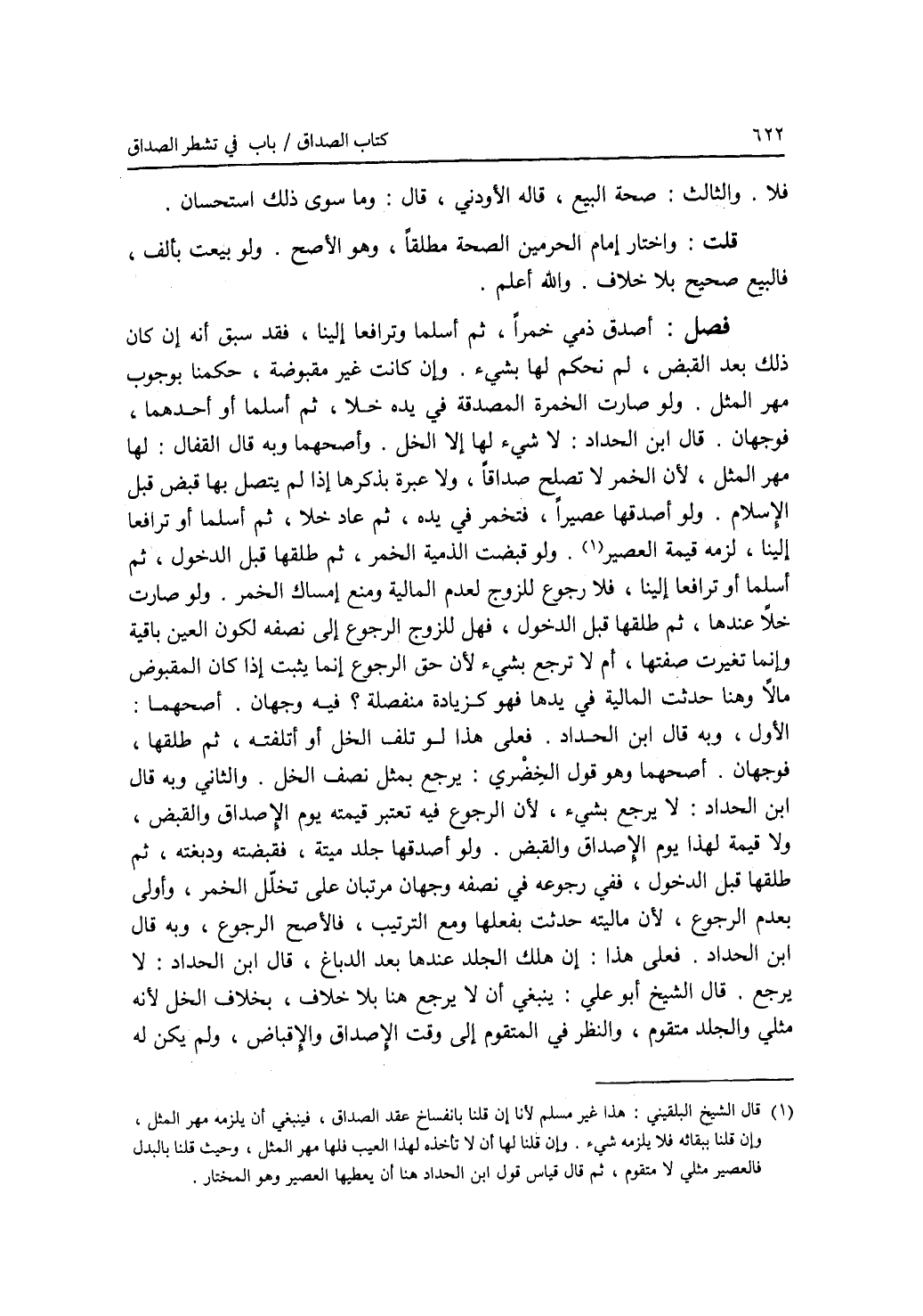 فلا. والثالث: صحة البيع قاله الاودني، قال: وما سوى ذلك استحسان. قلت: واختار إمام الحرمين الصحة مطلقا، وهو الاصح. ولو بيعت بألف، فالبيع صحيح بلا خلاف. والله أعلم. فصل أصدق ذمي خمرا، ثم أسلما وترافعا إلينا، فقد سبق أنه إن كان ذلك بعد القبض، لم نحكم لها بشئ. وإكانت غير مقبوضة، حكمنا بوجوب مهر المثل. ولو صارت الخمرة المصدقة في يده خلا، ثم أسلما أو أحدهما، فوجهان. قال ابن الحداد: لا شئ لها إلا الخل. وأصحهما وبه قال القفال: لها مهر المثل، لان الخمر لا تصلح صداقا، ولا عبرة بذكرها إذا لم يتصل بها قبض قبل الاسلام. ولو أصدقها عصيرا، فتخمر في يده، ثم عاد خلا، ثم أسلما أو ترافعا إلينا، لزمه قيمة العصير. ولو قبضت الذمية الخمر، ثم طلقها قبل الدخول، ثم أسلما أو ترافعا إلينا، فلا رجوع للزوج لعدم المالية ومنع إمساك الخمر. ولو صارت خلا عندها، ثم طلقها قبل الدخول، فهل للزوالرجوع إلى نصفه لكون العين باقية وإنما تغيرت صفتها، أم لا ترجع بشئ لان حق الرجوع إنما يثبت إذا كان المقبوض مالا وهنا حدثت المالية في يدها فهو كزيادة منفصلة ؟ فيه وجهان. أصحهما: الاول، وبه قال ابن الحداد. فعلى هذا لو تلف الخل أو أتلفته، ثم طلقها، فوجهان. أصحهما وهو قول الخضري: يرجع بمثل نصف الخل. والثاني وبه قال ابن الحداد: لا يرجع بشئ، لان الرجوع فيه تعتبر قيمته يوم الاصداق والقبض، ولا قيمة لهذا يوم الاصداق والقبض. ولو أصدقها جلد ميتة، فقبضته ودبغته، ثم طلقها قبل الدخول، ففي رجوعه في نصفه وجهان مرتبان على تخلل الخمر، وأولى بعدم الرجوع، لان ماليته حدثت بفعلها ومع الترتيب، فالاصح الرجوع، وبه قال ابن الحداد. فعلى هذا: إن هلك الجلد عندها بعد الدباغ، قال ابن الحداد: لا يرجع. قال الشيخ أبو علي: ينبغي أن لا يرجع هنا بلا خلاف، بخلاف الخل لانه مثلي والجلد متقوم، والنظر في المتقوم إلى وقت الاصداق والاقباض، ولم يكن له