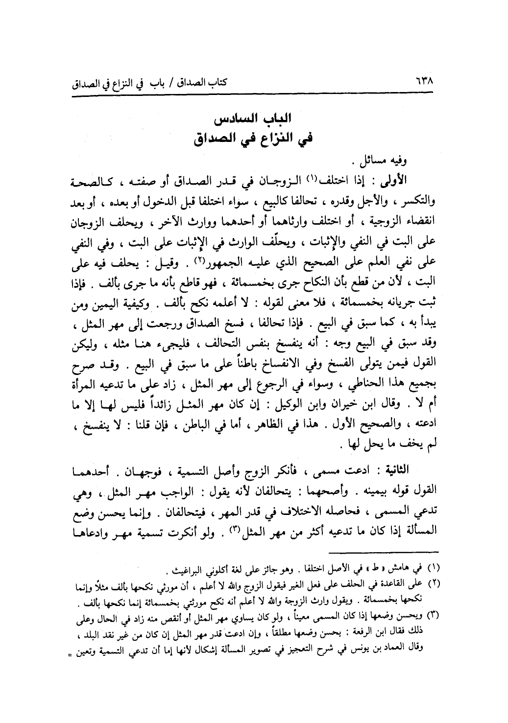 الباب السادس : في النزاع في الصداق وفيه مسائل. الاولى: إذا اختلف الزوجان في قدر الصداق أو صفته، كالصحة والتكسر، والاجل وقدره، تحالفا كالبيع، سواء اختلفا قبل الدخول أو بعده، أو بعد انقضاء الزوجية، أو اختلف وارثاهما أو أحدهم ووارث الآخر، ويحلف الزوجان على البت في النفي والاثبات، ويحلف الوارث في الاثبات على البت، وفي النفي على نفي العلم على الصحيح الذي عليه الجمهور. وقيل: يحلف فيه على البت، لان من قطع بأن النكاح جرى بخمسمائة، فهو قاطع بأنه ما جرى بألف. فإذا ثبت جريانه بخمسمائة، فلا معنى لقوله: لا أعلمه نكح بألف. وكيفية اليمين ومن يبدأ به، كما سبق في البيع. فإذا تحالفا، فسخ الصداق ورجعت إلى مهر المثل، وقد سبق في البيع وجه: أنه ينفسخ بنفس التحالف، فليجئ هنا مثله، وليكن القول فيمن يتولى الفسخ وفي الانفساخ باطنا على ما سبق في البيع. وقد صرح بجميع هذا الحناطي، وسواء في الرجوع إلى مهر المثل، زاد على ما تدعيه المرأة أم لا. وقال ابن خيران وابن الوكيل: إن كان مهر المثل زائدا فليس لها إلا ما ادعته، والصحيح الاول. هذا في الظاهر، أما في الباطن، فإن قلنا: لا ينفسخ، لم يخف ما يحل لها. الثانية: ادعت مسمى، فأنكر الزوج أصل التسمية، فوجهان. أحدهما: القول قوله بيمينه. وأصحهما: يتحالفان لان يقول: الواجب مهر المثل، وهي تدعي المسمى، فحاصله الاختلاف في قدر المهر، فيتحالفان. وإنما يحسن وضع المسألة إذا كان ما تدعيه أكثر من مهر المثل. ولو أنكرت تسمية مهر وادعاها