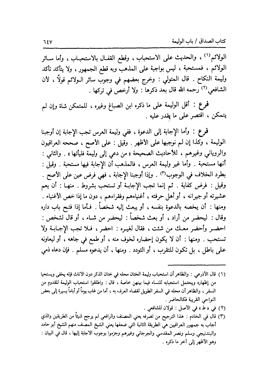 الولائم، والحديث على الاستحباب، وقطع القفال بالاستحباب، وأما سائر الولائم، فمستحبة، ليس بواجبة على المذهب وبه قطع الجمهور، ولا يتأكذ تأكد وليمة النكاح. قال المتولي: وخرج بعضهم في وجوب سائر الولائم قولا، لان الشافعي رحمه الله قال بعد ذكرها: ولا أرخص في تركها. فرع أقل الوليمة على ما ذكره ابن الصباغ وغيره، للمتمكن شاة وإن لم يتمكن، اقتصر على ما يقدر عليه. فرع وأما الاجابة إلى الدعوة، ففي وليمة العرس تجب الاجابة إن أوجبنا الوليمة، وكذا إن لم نوجبها على الاظهر. وقيل: على الاصح، صححه العراقيون والروياني وغيرهم، للاحاديث الصحيحة من دعي إلى وليمة فليأتها. والثاني: أنها مستحبة. وأما غير وليمة العرس، فالمذهب أن الاجابة فيها مستحبة. وقيل: بطرد الخلاف في الوجوب. وإذا أوجبنا الاجابة، فهي فرض عين على الاصح. وقيل: فرض كفاية. ثم إنما تجب الاجابة أو تستحب بشروط. منها: أن يعم عشيرته أو جيرانه، أو أهل حرفته، أغنياءهم وفقراءهم، دون ما إذا خص الاغنياء. ومنها: أن يخصه بالدعوة بنفسه، أو يبعث إليه شخصا. فأما إذا فتح باب داره وقال: ليحضر من أراد، أو بعث شخصا: ليحضر من شاء، أو قال لشخص: احضر وأحضر معك من شئت، فقال لغيره: احضر، فلا تجب الاجابة ولا تستحب. ومنها: أن لا يكون إحضاره لخوف منه، أو طمع في جاهه، أو ليعاونه على باطل، بل تكون للتقرب، أو التودد. ومنها، أن يدعوه مسلم. فإن دعاه ذمي