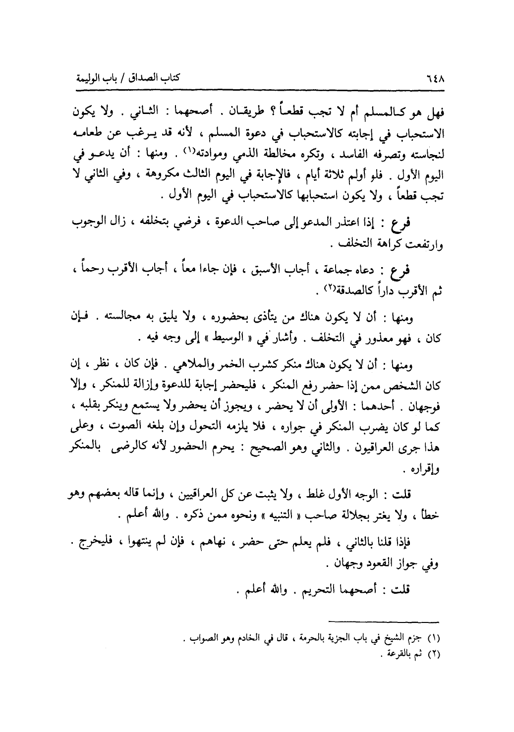 فهل هو كالمسلم أم لا تجب قطعا ؟ طريقان. أصحهما: الثاني. ولا يكون الاستحباب في إجابته كالاستحباب في دعوة المسلم، لانه قد يرغب عن طعامه لنجاسته وتصرفه الفاسد، وتكره مخالطة الذمي وموادته. ومنها: أن يدعو في اليوم الاول. فلو أولم ثلاثة أيام، فالاجابة في اليوم الثالث مكروهة، وفي الثاني لا تجب قطعا، ولا يكون استحبابها كالاستحباب في اليوم الاول. فرع إذا اعتذر المدعو إلى صاحب الدعوة، فرضي بتخلفه، زال الوجوب وارتفعت كراهة التخلف. فرع دعاه جماعة، أجاب الاسبق، فإن جاءا معا، أجاب الاقرب رحما، ثم الاقرب دارا كالصدقة. ومنها: أن لا يكون هناك من يتأذى بحضوره، ولا يليق به مجالسته. فإن كان، فهو معذور في التخلف. وأشار في الوسيط إلى وجه فيه. ومنها: أن لا يكون هناك منكر كشرب الخمر والملاهي. فان كان، نظر، إن كان الشخص ممن إذا حضر رفع المنكر، فليحضر إجابة للدعوة وإزالة للمنكر، وإلا فوجهان. أحدهما: الاولى أن لا يحضر، ويجوز أن يحضر ولا يستمع وينكر بقلبه، كما لو كان يضرب المنكر في جواره، فلا يلزمه التحول وإن بلغه الصوت، وعلى هذا جرى العراقيون. والثاني وهو الصحيح: يحرم الحضور لانه كالرضى بالمنكر وإقراره. قلت: الوجه الاول غلط، ولا يثبت عن كل العراقيين، وإنما قاله بعضهم وهو خطأ، ولا يغتر بجلالة صاحب التنبيه ونحوه ممن ذكره. والله أعلم. فإذا قلنا بالثاني، فلم يعلم حتى حضر، نهاهم، فان لم ينتهوا، فليخرج. وفي جواز القعود وجهان. قلت: أصحهما: التحريم. والله أعلم.