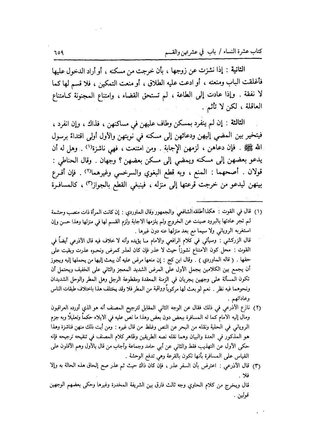 يحرم الخلوة بها. الثانية: إذا نشزت عن زوجها، بأن خرجت من مسكنه، أو أراد الدخول عليها فأغلقت الباب ومنعته، أو ادعت عليه الطلاق، أو منعت التمكين، فلا قسم لها كما لا نفقة. وإذا عادت إلى الطاعة، لم تستحق القضاء، وامتناع المجنونة كامتناع العاقلة، لكن لا تأثم. الثالثة: إن لم ينفرد بمسكن وطاف عليهن في مساكنهن، فذاك، وإن انفرد، فيتخير بين المضي إليهن ودعائهن إلى مسكنه في نوبتهن والاول أولى اقتداء برسول الله - صلى الله عليه وسلم -. فإن دعاهن، لزمهن الاجابة. ومن امتنعت، فهي ناشزة. وهل له أن يدعو بعضهن إلى مسكنه ويمضي إلى مسكن بعضهن ؟ وجهان. وقال الحناطي: قولان. أصحهما: المنع، وبه قطع البغوي والسرخسي وغيرهما. فإن أقرع بينهن ليدعو من خرجت قرعتها إلى منزله، فينبغي القطع بالجواز، كالمسافرة