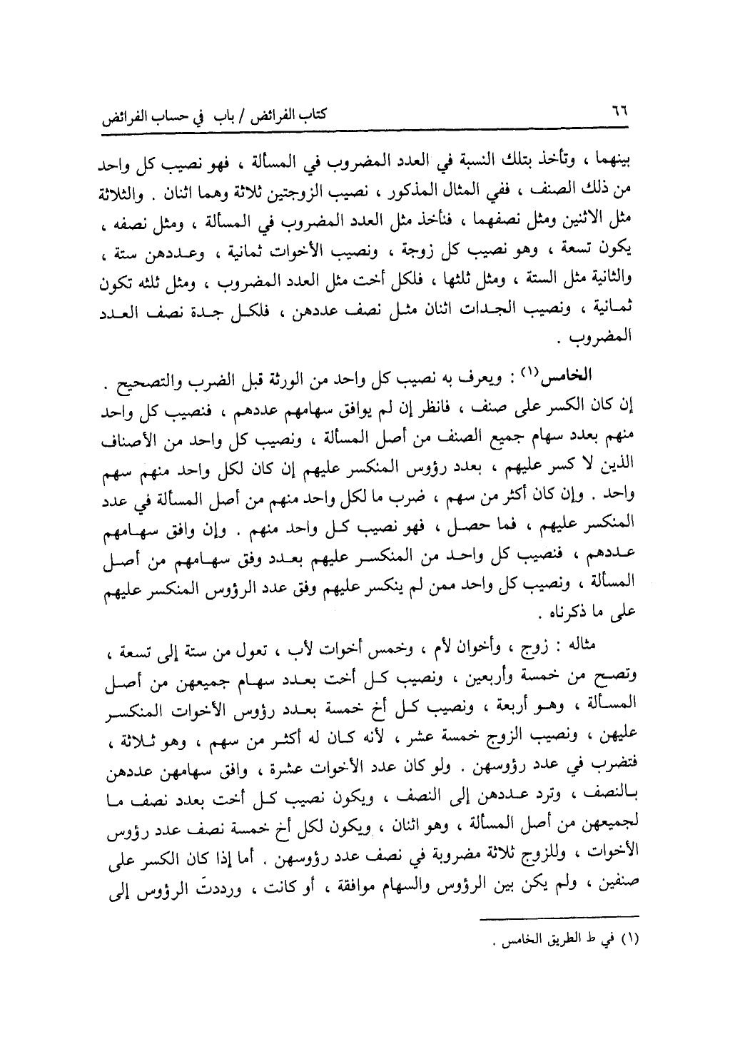 بينهما وتأخذ بتلك النسبة في العدد المضروب في المسألة، فهو نصيب كل واحد من ذلك الصنف، ففي المثال المذكور، نصيب الزوجتين ثلاثة وهما اثنان. والثلاثة مثل الاثنين ومثل نصفهما، فتأخذ مثل العدد المضروب في المسألة، ومثل نصفه، يكون تسعة، وهو نصيب كل زوجة، ونصيب الاخوات ثمانية، وعددهن ستة، والثمانية مثل الستة، ومثل ثلثها، فلكل أخت مثل العدد المضروب. ومثل ثلثه تكون ثمانية، ونصيب الجدات اثنان مثل نصف عددهن، فلكل جدة نصف العدد المضروب. الطريق الخامس: ويعرف به نصيب كل واحد من الورثة قبل الضرب والتصحيح. إن كان الكسر على صنف، فانظر إن لم يوافق سهامهم عددهم، فنصيب كل واحد منهم بعدد سهام جميع الصنف من أصل المسألة، ونصيب كل واحد من الاصناف الذين لا كسر عليهم، بعدد رؤوس المنكسر عليهم إن كان لكل واحد منهم سهم واحد. وإن كان أكثر من سهم، ضرب ما لكل واحد منهم من أصل المسألة في عدد المنكسر عليهم، فما حصل، فهو نصيب كل واحد منهم. وإن وافق سهامهم عددهم، فنصيب كل واحد من المنكسر عليهم بعدد وفق سهامهم من أصل المسألة، ونصيب كل واحد ممن لم ينكسر عليهم وفق عدد الرؤوس المنكسر عليهم على ما ذكرناه. مثاله: زوج، وأخوان لام، وخمس أخوات لاب، تعول من ستة إلى تسعة، وتصح من خمسة وأربعين، ونصيب كل أخت بعدد سهام جميعهن من أصل المسألة، وهو أربعة، ونصيب كل أخ خمسة بعدد رؤوس الاخوات المنكسر عليهن، ونصيب الزوج خمسة عشر، لانه كان له أكثر من سهم، وهو ثلاثة، فتضرب في عدد رؤوسهن. ولو كان عدد الاخوات عشرة، وافق سهامهن عددهن بالنصف، وترد عددهن إلى النصف، ويكون نصيب كل أخت بعدد نصف ما لجميعهن من أصل المسألة، وهو اثنان، ويكون لكل أخ خمسة نصف عدد رؤوس الاخوات، وللزوج ثلاثة مضروبة في نصف عدد رؤوسهن. أما إذا كان الكسر على صنفين، ولم يكن بين الرؤوس والسهام موافقة، أو كانت، ورددت الرؤوس إلى