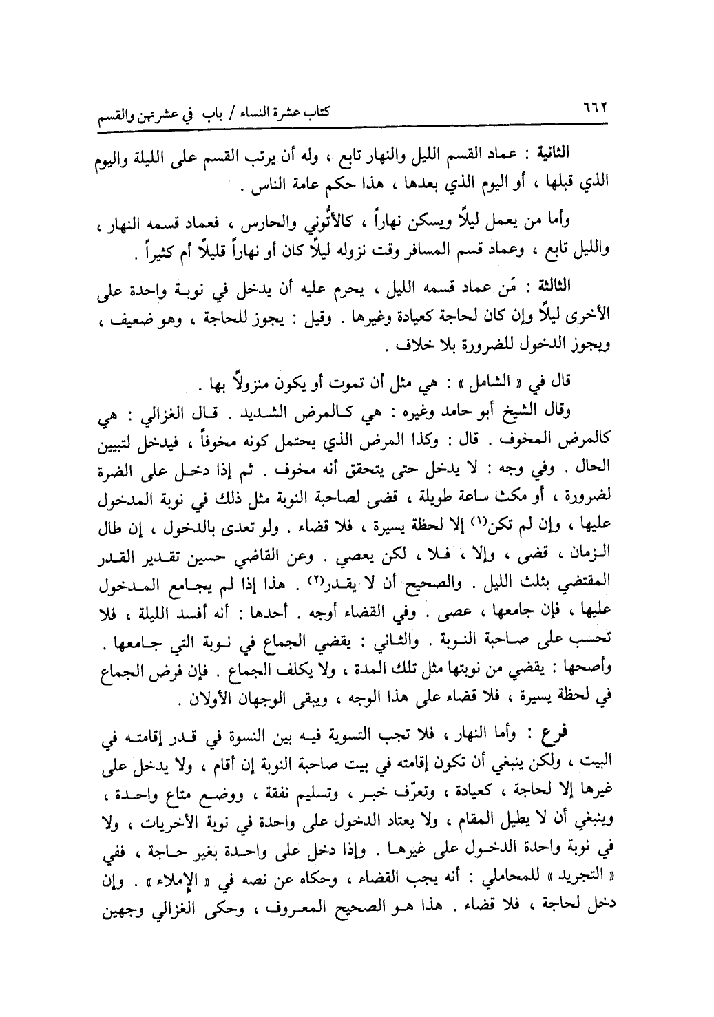 الثانية: عماد القسم الليل والنهار تابع، وله أن يرتب القسم على الليلة واليوم الذي قبلها، أو اليوم الذي بعدها، هذا حكم عامة الناس. وأما من يعمل ليلا ويسكن نهارا، كالاتوني والحارس، فعماد قسمه النهار، والليل تابع، وعماد قسم المسافر وقت نزوله ليلا كان أو نهارا قليلا أم كثيرا. الثالثة: من عماد قسمه الليل، يحرم عليه أن يدخل في نوبة واحدة على الاخرى ليلا وإن كان لحاجة كعيادة وغيرها. وقيل: يجوز للحاجة، وهو ضعيف، ويجوز الدخول للضرورة بلا خلاف. قال في الشامل: هي مثل أن تموت أو يكون منزولا بها. وقال الشيخ أبو حامد وغيره: هي كالمرض الشديد. قال الغزالي: هي كالمرض المخوف. قال: وكذا المرض الذي يحتمل كونه مخوفا، فيدخل لتبيين الحال. وفي وجه: لا يدخل حتى يتحقق أنه مخوف. ثم إذا دخل على الضرة لضرورة، أو مكث ساعة طويلة، قضى لصاحبة النوبة مثل ذلك في نوبة المدخول عليها، وإن لم تكن إلا لحظة يسيرة، فلا قضاء. ولو تعدى بالدخول، إن طال الزمان، قضى، وإلا، فلا، لكن يعصي. وعن القاضي حسين تقدير القدر المقتضي بثلث الليل. والصحيح أن لا يقدر. هذا إذا لم يجامع المدخول عليها، فإن جامعها، عصى. وفي القضاء أوجه. أحدها: أنه أفسد الليلة، فلا تحسب على صاحبة النوبة. والثاني: يقضي الجماع في نوبة التي جامعها. وأصحها: يقضي من نوبتها مثل تلك المدة، ولا يكلف الجماع. فإن فرض الجماع في لحظة يسيرة، فلا قضاء على هذا الوجه، ويبقى الوجهان الاولان. فرع وأما النهار، فلا تجب التسوية فيه بين النسوة في قدر إقامته في البيت، ولكن ينبغي أن تكون إقامته في بيت صاحبة النوبة إن أقام، ولا يدخل على غيرها إلا لحاجة، كعيادة، وتعرف خبر، وتسليم نفقة، ووضع متاع واحدة. وينبغي أن لا يطيل المقام، ولا يعتاد الدخول على واحدة في نوبة الاخريات، ولا في نوبة واحدة الدخول على غيرها. وإذا دخل على واحدة بغير حاجة، ففي التجريد للمحاملي: أنه يجب القضاء، وحكاه عن نصه في الاملاء. وإن دخل لحاجة، فلا قضاء. هذا هو الصحيح المعروف، وحكى الغزالي وجهين