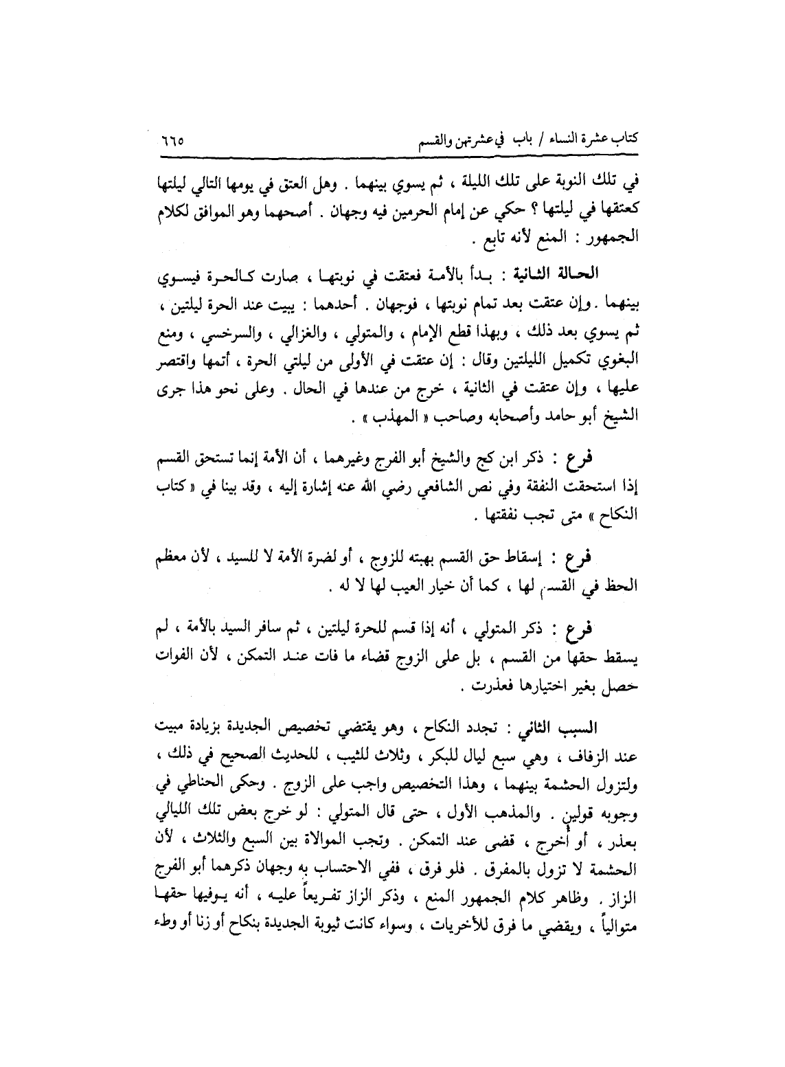في تلك النوبة على تلك الليلة، ثم يسوي بينهما. وهل العتق في يومها التالي ليلتها كعتقها في ليلتها ؟ حكي عن إمام الحرمين فيه وجهان. أصحهما وهو الموافق لكلام الجمهور: المنع لانه تابع. الحالة الثانية: بدأ بالامة فعتقت في نوبتها، صارت كالحرة فيسوي بينهما وإن عتقت بعد تمام نوبتها، فوجهان. أحدهما: يبيت عند الحرة ليلتين، ثم يسوي بعد ذلك، وبهذا قطع الامام، والمتولي، والغزالي، والسرخسي، ومنع البغوي تكميل الليلتين وقال: إن عتقت في الاولى من ليلتي الحرة، أتمها واقتصر عليها، وإن عتقت في الثانية، خرج من عندها في الحال. وعلى نحو هذا جرى الشيخ أبو حامد وأصحابه وصاحب المهذب. فرع ذكر ابن كج والشيخ أبو الفرج وغيرهما، أن الامة إنما تستحق القسم إذا استحقت النفقة وفي نص الشافعي رضي الله عنه إشارة إليه، وقد بينا في كتاب النكاح متى تجب نفقتها. فرع إسقاط حق القسم بهبته للزوج، أو لضرة الامة لا للسيد، لان معظم الحظ في القسم لها، كما أن خيار العيب لها لا له. فرع ذكر المتولي، أنه إذا قسم للحرة ليلتين، ثم سافر السيد بالامة، لم يسقط حقها من القسم، بل على الزوج قضاء ما فات عند التمكن، لان الفوات حصل بغير اختيارها فعذرت. السبب الثاني: تجدد النكاح، وهو يقتضي تخصيص الجديدة بزيادة مبيت عند الزفاف، وهي سبع ليال للبكر، وثلاث للثيب، للحديث الصحيح في ذلك، ولتزول الحشمة بينهما، وهذا التخصيص واجب على الزوج. وحكى الحناطي في وجوبه قولين. والمذهب الاول، حتى قال المتولي: لو خرج بعض تلك الليالي بعذر، أو أخرج، قضى عند التمكن. وتجب الموالاة بين السبع والثلاث، لان الحشمة لا تزول بالمفرق. فلو فرق، ففي الاحتساب به وجهان ذكرهما أبو الفرج الزاز. وظاهر كلام الجمهور المنع، وذكر الزاز تفريعا عليه، أنه يوفيها حقها متواليا، ويقضي ما فرق للاخريات، وسواء كانت ثيوبة الجديدة بنكاح أو زنا أو وطئ