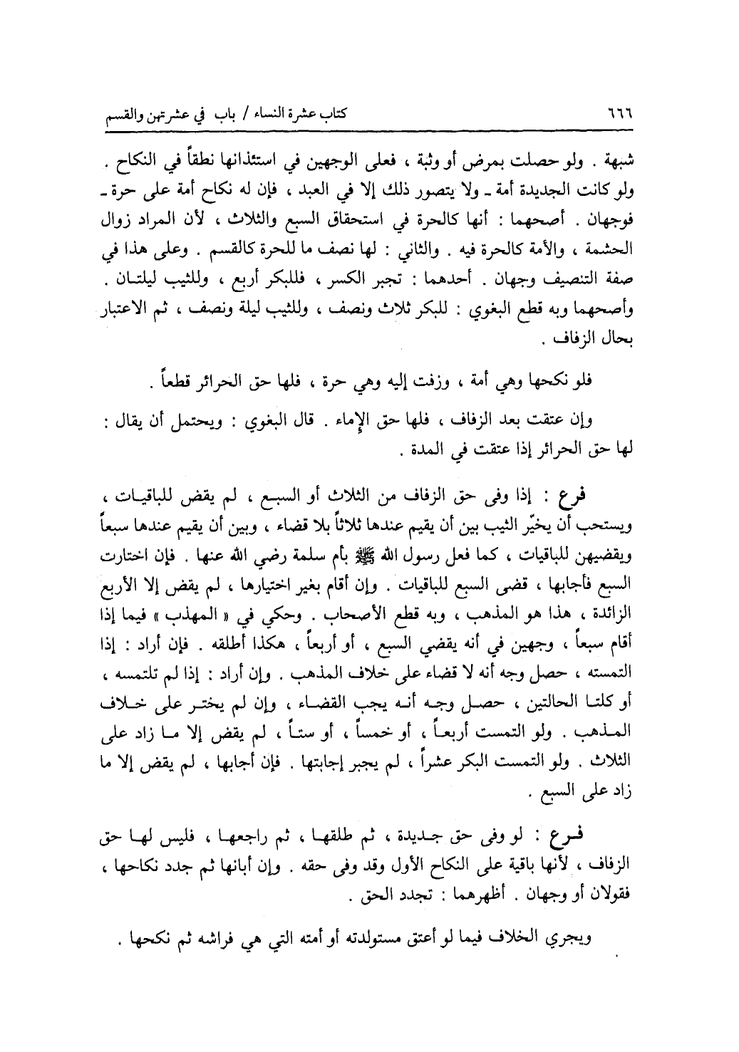 شبهة. ولو حصلت بمرض أو وثبة، فعلى الوجهين في استئذانها نطقا في النكاح. ولو كانت الجديدة أمة - ولا يتصور ذلك إلا في العبد، فإن له نكاح أمة على حرة - فوجهان. أصحهما: أنها كالحرة في استحقاق السبع والثلاث، لان المراد زوال الحشمة، والامة كالحرة فيه. والثاني: لها نصف ما للحرة كالقسم. وعلى هذا في صفه التنصيف وجهان. أحدهما: تجبر الكسر، فللبكر أربع، وللثيب ليلتان. وأصحهما وبه قطع البغوي: للبكر ثلاث ونصف، وللثيب ليلة ونصف، ثم الاعتبار بحال الزفاف. فلو نكحها وهي أمة، وزفت إليه وهي حرة، فلها حق الحرائر قطعا. وإن عتقت بعد الزفاف، فلها حق الاماء. قال البغوي: ويحتمل أن يقال: لها حق الحرائر إذا عتقت في المدة. فرع إذا وفى حق الزفاف من الثلاث أو السبع، لم يقض للباقيات، ويستحب أن يخير الثيب بين أن يقيم عندها ثلاثا بلا قضاء، وبين أن يقيم عندها سبعا ويقضيهن للباقيات، كما فعل رسول الله - صلى الله عليه وسلم - بأم سلمة رضي الله عنها. فإن اختارت السبع فأجابها، قضى السبع للباقيات. وإن أقام بغير اختيارها، لم يقض إلا الاربع الزائدة، هذا هو المذهب، وبه قطع الاصحاب. وحكي في المهذب فيما إذا أقام سبعا، وجهين في أنه يقضي السبع، أو أربعا، هكذا أطلقه. فإن أراد: إذا التمسته، حصل وجه أنه لا قضاء على خلاف المذهب. وإن أراد: إذا لم تلتمسه، أو كلتا الحالتين، حصل وجه أنه يجب القضاء، وإن لم يختر على خلاف المذهب. ولو التسمت أربعا، أو خمسا، أو ستا، لم يقض إلا ما زاد على الثلاث. ولو التمست البكر عشرا، لم يجبر إجابتها. فإن أجابها، لم يقض إلا ما زاد على السبع. فرع لو وفى حق جديدة، ثم طلقها، ثم راجعها، فليس لها حق الزفاف، لانها باقية على النكاح الاول وقد وفى حقه. وإن أبانها ثم جدد نكاحها، فقولان أو وجهان. أظهرهما: تجدد الحق. ويجري الخلاف فيما لو أعتق مستولدته أو أمته التي هي فراشه ثم نكحها.