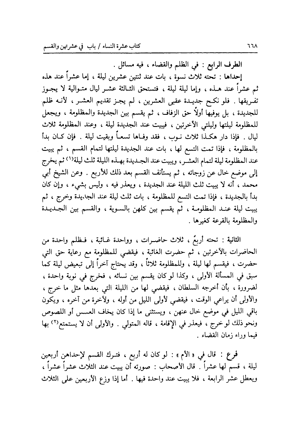 الطرف الرابع : في الظلم والقضاء، فيه مسائل. إحداها: تحته ثلاث نسوة، بات عند ثنتين عشرين ليلة، إما عشرا عند هذه ثم عشرا عند هذه، وإما ليلة ليله، فتستحق الثالثة عشر ليال متوالية لا يجوز تفريقها. فلو نكح جديدة عقبى العشرين، لم يجز تقديم العشر، لانه ظلم للجديدة، بل يوفيها أولا حق الزفاف، ثم يقسم بين الجديدة والمظلومة، ويجعل للمظلومة ليلتها وليلتي الآخرتين، فيبيت عند الجديدة ليلة، وعند المظلومة ثلاث ليال. فإذا دار هكذا ثلاث نوب، فقد وفاها تسعا وبقيت ليلة. فإن كان بدأ بالمظلومة، فإذا تمت التسع لها، بات عند الجديدة ليلتها لتمام القسم، ثم يبيت عند المظلومة ليلة لتمام العشر، ويبيت عند الجديدة بهذه الليلة ثلث ليلة ثم يخرج إلى موضع خال عن زوجاته، ثم يستأنف القسم بعد ذلك للاربع. وعن الشيخ أبي محمد، أنه لا يبيت ثلث الليلة عند الجديدة، ويعذر فيه، وليس بشئ، وإن كان بدأ بالجديدة، فإذا تمت التسع للمظلومة، بات ثلث ليلة عند الجديدة وخرج، ثم يبيت ليلة عند المظلومة، ثم يقسم بين كلهن بالسوية، والقسم بين الجديدة والمظلومة بالقرعة كغيرها. الثانية: تحته أربع، ثلاث حاضرات، وواحدة غائبة، فظلم واحدة من الحاضرات بالآخرتين، ثم حضرت الغائبة، فيقضي للمظلومة مع رعاية حق التي حضرت، فيقسم لها ليلة، وللمظلومة ثلاثا، وقد يحتاج آخرا إلى تبعيض ليلة كما سبق في المسألة الاولى، وكذا لو كان يقسم بين نسائه، فخرج في نوبة واحدة، لضرورة، بأن أخرجه السلطان، فيقضي لها من الليلة التي بعدها مثل ما خرج، والاولى أن يراعي الوقت، فيقضي لاولى الليل من أوله، ولآخرة من آخره، ويكون باقي الليل في موضع خال عنهن، ويستثنى ما إذا كان يخاف العسس أو اللصوص ونحو ذلك لو خرج، فيعذر في الاقامة، قاله المتولي. والاولى أن لا يستمتع بها فيما وراء زمان القضاء. فرع قال في الام: لو كان له أربع، فترك القسم لاحداهن أربعين ليلة، قسم لها عشرا. قال الاصحاب: صورته أن يبيت عند الثلاث عشرا عشرا، ويعطل عشر الرابعة، فلا يبيت عند واحدة فيها. أما إذا وزع الاربعين على الثلاث