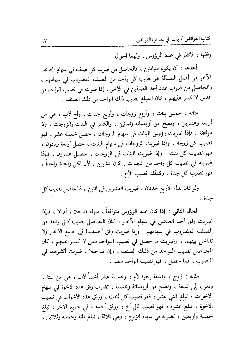 وفقها، فانظر في عدد الرؤوس، ولهما احوال. أحدها: أن يكونا متباينين، فالحاصل من ضرب كل صنف في سهام الصنف الآخر من أصل المسألة هو نصيب كل واحد من الصنف المضروب في سهامهم، والحاصل من ضرب عدد أحد الصنفين في الآخر، إذا ضربته في نصيب الواحد من الذين لا كسر عليهم، كان المبلغ نصيب ذلك الواحد من ذلك الصنف. مثاله: خمس بنات، وأربع زوجات، وأربع جدات، وأخ لاب، هي من أربعة وعشرين، وتصح من أربعمائة وثمانين، والكسر في البنات والزوجات، ولا موافقة. فإذا ضربت رؤوس البنات في سهام الزوجات، حصل خمسة عشر، فهو نصيب كل زوجة. وإذا ضربت الزوجات في سهام البنات، حصل أربعة وستون، فهو نصيب كل بنت. وإذا ضربت البنات في الزوجات، حصل عشرون. فإذا ضربته في نصيب كل واحد من الجدات، كان عشرين، لان لكل واحدة واحدا، فهو نصيب كل جدة. وكذلك نصيب الاخ. ولو كان بدل الاربع جدتان، ضربت العشرين في اثنين، فالحاصل نصيب كل جدة. الحال الثاني: إذا كان عدد الرؤوس متوافقا، سواء تداخلا، أم لا، فإذا ضربت وفق أحد العددين في سهام الآخر، كان الحاصل نصيب كل واحد من الصنف المضروب في سهامهم. وإذا ضربت وفق أحدهما في جميع الآخر ولا تداخل بينهما، وضربت ما حصل في نصيب الواحد ممن لا كسر عليهم، كان الحاصل نصيب الواحد من ذلك الصنف، وإن تداخلا، ضربت أكثرهما في النصيب، فما حصل، فهو نصيب الواحد منهم. مثاله: زوج، وتسعة إخوة لام، وخمسة عشر أختا لاب، هي من ستة، وتعول إلى تسعة، وتصح من أربعمائة وخمسة، تضرب وفق عدد الاخوة في سهام الاخوات، تبلغ اثني عشر، فهو نصيب كل أخت، ووفق عدد الاخوات في نصيب الاخوة، تبلغ عشرة، فهو نصيب كل أخ، ووفق أحدهما في جميع الآخر، تبلغ خمسة وأربعين، تضربه في سهام الزوج، وهي ثلاثة، تبلغ مائة وخمسة وثلاثين،