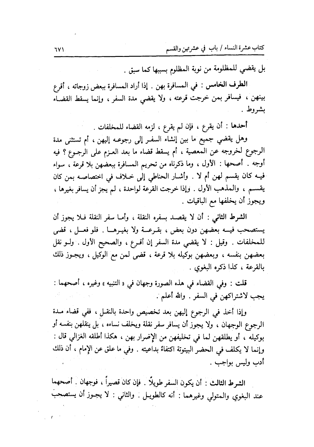 الطرف الخامس : في المسافرة بهن. إذا أراد المسافرة ببعض زوجاته، أقرع بينهن، فيسافر بمن خرجت قرعته، ولا يقضي مدة السفر، وإنما يسقط القضاء بشروط. أحدها: أن يقرع، فإن لم يقرع، لزمه القضاء للمخلفات. وهل يقضي جميع ما بين إنشاء السفر إلى رجوعه إليهن، أم تستثنى مدة الرجوع لخروجه عن المعصية، أم يسقط قضاء ما بعد العزم على الرجوع ؟ فيه أوجه. أصحها: الاول، وما ذكرناه من تحريم المسافرة ببعضهن بلا قرعة، سواء فيه كان يقسم لهن أم لا. وأشار الحناطي إلى خلاف في اختصاصه بمن كان يقسم، والمذهب الاول. وإذا خرجت القرعة لواحدة، لم يجز أن يسافر بغيرها، ويجوز أن يخلفها مع الباقيات. الشرط الثاني: أن لا يقصد بسفره النقلة، وأما سفر النقلة فلا يجوز أن يستصحب فيه بعضهن دون بعض، بقرعة ولا بغيرها. فلو فعل، قضى للمخلفات. وقيل: لا يقضي مدة السفر إن أقرع، والصحيح الاول. ولو نقل بعضهن بنفسه، وبعضهن بوكيله بلا قرعة، قضى لمن مع الوكيل، ويجوز ذلك بالقرعة، كذا ذكره البغوي. قلت: وفي القضاء في هذه الصورة وجهان في التنبيه وغيره، أصحهما: يجب لاشتراكهن في السفر. والله أعلم. وإذا أخذ في الرجوع إليهن بعد تخصيص واحدة بالنقل، ففي قضاء مدة الرجوع الوجهان، ولا يجوز أن يسافر سفر نقلة ويخلف نساءه، بل ينقلهن بنفسه أو بوكيله، أو يطلقهن لما في تخليفهن من الاضرار بهن، هكذا أطلقه الغزالي قال: وإنما لا يكلف في الحضر البيتوتة اكتفاء بداعيته. وفي ما علق عن الامام، أن ذلك أدب وليس بواجب. الشرط الثالث: أن يكون السفر طويلا. فإن كان قصيرا، فوجهان. أصحهما عند البغوي والمتولي وغيرهما: أنه كالطويل. والثاني: لا يجوز أن يستصحب