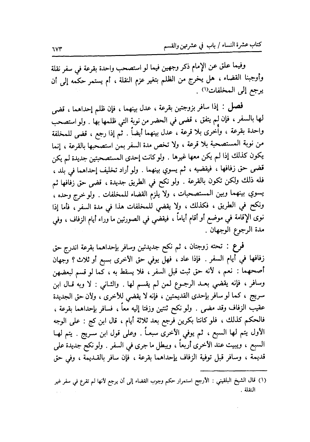 وفيما علق عن الامام ذكر وجهين فيما لو استصحب واحد بقرعة في سفر نقلة وأوجبنا القضاء، هل يخرج من الظلم بتغير عزم النقلة، أم يستمر حكمه إلى أن يرجع إلى المخلفات. فصل إذا سافر بزوجتين بقرعة، عدل بينهما، فإن ظلم إحداهما، قضى لها بالسفر، فإن لم يتفق، قضى في الحضر من نوبة التي ظلمها بها. ولو استصحب واحدة بقرعة، وأخرى بلا قرعة، عدل بينهما أيضا. ثم إذا رجع، قضى للمخلفة من نوبة المستصحبة بلا قرعة، ولا تخص مدة السفر بمن استصحبها بالقرعة، إنما يكون كذلك إذا لم يكن معها غيرها. ولو كانت إحدى المستصحبتين جديدة لم يكن قضى حق زفافها، فيقضيه، ثم يسوي بينهما. ولو أراد تخليف إحداهما في بلد، فله ذلك ولكن تكون بالقرعة. ولو نكح في الطريق جديدة، قضى حق زفافها ثم يسوي بينهما وبين المستصحبات، ولا يلزم القضاء للمخلفات. ولو خرج وحده، ونكح في الطريق، فكذلك، ولا يقضي للمخلفات هذا في مدة السفر، فأما إذا نوى الاقامة في موضع أو أقام أياما، فيقضي في الصورتين ما وراء أيام الزفاف، وفي مدة الرجوع الوجهان. فرع تحته زوجتان، ثم نكح جديدتين وسافر بإحداهما بقرعة اندرج حق زفافها في أيام السفر. فإذا عاد، فهل يوفي حق الاخرى بسبع أو ثلاث ؟ وجهان أصحهما: نعم، لانه حق ثبت قبل السفر، فلا يسقط به، كما لو قسم لبعضهن وسافر، فإنه يقضي بعد الرجوع لمن لم يقسم. لها. والثاني: لا وبه قال ابن سريج، كما لو سافر بإحدى القديمتين، فإنه لا يقضي للاخرى، ولان حق الجديدة عقيب الزفاف وقد مضى. ولو نكح ثنتين وزفتا إليه معا، فسافر بإحداهما بقرعة، فالحكم كذلك، فلو كانتا بكرين فرجع بعد ثلاثة أيام، قال ابن كج: على الوجه الاول يتم لها السبع، ثم توفي الاخرى سبعا. وعلى قول ابن سريج: يتم لها السبع، ويبيت عند الاخرى أربعا، ويبطل ما جرى في السفر. ولو نكح جديدة على قديمة، وسافر قبل توفية الزفاف بإحداهما بقرعة، فإن سافر بالقديمة، وفى حق