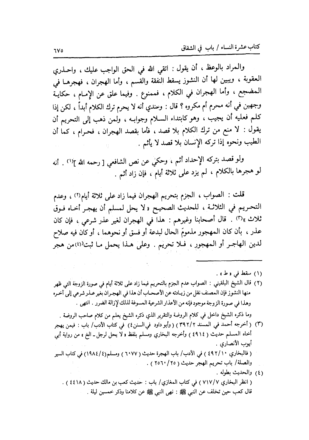 والمراد بالوعظ، أن يقول: اتقي الله في الحق الواجب عليك، واحذري العقوبة، ويبين لها أن النشوز يسقط النفقة والقسم، وأما الهجران، فهجرها في المضجع، وأما الهجران في الكلام، فممنوع. وفيما علق عن الامام، حكاية وجهين في أنه محرم أم مكروه ؟ قال: وعندي أنه لا يحرم ترك الكلام أبدا، لكن إذا كلم فعليه أن يجيب، وهو كابتداء السلام وجوابه، ولمن ذهب إلى التحريم أن يقول: لا منع من ترك الكلام بلا قصد، فأما بقصد الهجران، فحرام، كما أن الطيب ونحوه إذا تركه الانسان بلا قصد لا يأثم. ولو قصد بتركه الاحداد أثم، وحكي عن نص الشافعي، أنه لو هجرها بالكلام، لم يزد على ثلاثة أيام، فإن زاد أثم. قلت: الصواب، الجزم بتحريم الهجران فيما زاد على ثلاثة أيام، وعدم التحريم في الثلاثة، للحديث الصحيح لا يحل لمسلم أن يهجر أخاه فوق ثلاث. قال أصحابنا وغيرهم: هذا في الهجران لغير عذر شرعي، فإن كان عذر، بأن كان المهجور مذموم الحال لبدعة أو فسق أو نحوهما، أو كان فيه صلاح لدين الهاجر أو المهجور، فلا تحريم. وعلى هذا يحمل ما ثبت من هجر