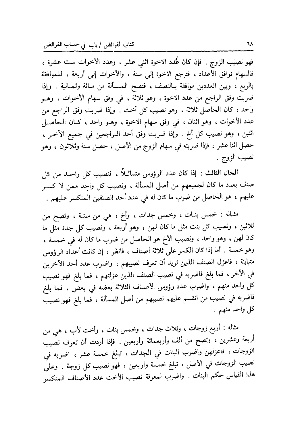 فهو نصيب الزوج. فان كان عدد الاخوة اثني عشر، وعدد الاخوات ست عشرة، فالسهام توافق الاعداد، فترجع الاخوة إلى ستة، والاخوات إلى أربعة، للموافقة بالربع، وبين العددين موافقة بالنصف، فتصح المسألة من مائة وثمانية. وإذا ضربت وفق الراجع من عدد الاخوة، وهو ثلاثة، في وفق سهام الاخوات، وهو واحد، كان الحاصل ثلاثة، وهو نصيب كل أخت. وإذا ضربت وفق الراجع من عدد الاخوات، وهو اثنان، في وفق سهام الاخوة، وهو واحد، كان الحاصل اثنين، وهو نصيب كل أخ. وإذا ضربت وفق أحد الراجعين في جميع الآخر، حصل اثنا عشر، فإذا ضربته في سهام الزوج من الاصل، حصل ستة وثلاثون، وهو نصيب الزوج. الحال الثالث: إذا كان عدد الرؤوس متماثلا، فنصيب كل واحد من كل صنف بعدد ما كان لجميعهم من أصل المسألة، ونصيب كل واحد ممن لا كسر عليهم، هو الحاصل من ضرب ما كان له في عدد أحد الصنفين المنكسر عليهم. مثاله: خمس بنات، وخمس جدات، وأخ، هي من ستة، وتصح من ثلاثين، ونصيب كل بنت مثل ما كان لهن، وهو أربعة، ونصيب كل جدة مثل ما كان لهن، وهو واحد، ونصيب الاخ هو الحاصل من ضرب ما كان له في خمسة، وهو خمسة. أما إذا كان الكسر على ثلاثة أصناف، فانظر، إن كانت أعداد الرؤوس متباينة، فاعزل الصنف الذين تريد أن تعرف نصيبهم، واضرب عدد أحد الآخرين في الآخر، فما بلغ فاضربه في نصيب الصنف الذين عزلتهم، فما بلغ فهو نصيب كل واحد منهم، واضرب عدد رؤوس الاصناف الثلاثة بعضه في بعض، فما بلغ فاضربه في نصيب من انقسم عليهم نصيبهم من أصل المسألة، فما بلغ فهو نصيب كل واحد منهم. مثاله: أربع زوجات، وثلاث جدات، وخمس بنات، وأخت لاب، هي من أربعة وعشرين، وتصح من ألف وأربعمائة وأربعين. فإذا أردت أن تعرف نصيب الزوجات، فاعزلهن واضرب البنات في الجدات، تبلغ خمسة عشر، اضربه في نصيب الزوجات في الاصل، تبلغ خمسة وأربعين، فهو نصيب كل زوجة. وعلى هذا القياس حكم البنات. واضرب لمعرفة نصيب الاخت عدد الاصناف المنكسر