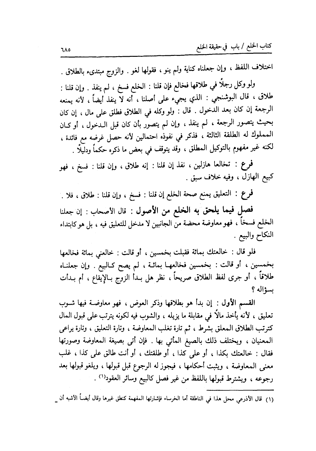 اختلاف اللفظ، وإن جعلناه كناية ولم ينو، فقولها لغو. والزوج مبتدئ بالطلاق. ولو وكل رجلا في طلاقها فخالع، فإن قلنا: الخلع فسخ، لم ينفذ. وإن قلنا: طلاق، قال البوشنجي: الذي يجئ على أصلنا، أنه لا ينفذ أيضا، لانه يمنعه الرجعة إن كان بعد الدخول. قال: ولو وكله في الطلاق فطلق على مال، إن كان بحيث يتصور الرجعة، لم ينفذ، وإن لم يتصور بأن كان قبل الدخول، أو كان المملوك له الطلقة الثالثة، فذكر في نفوذه احتمالين لانه حصل غرضه مع فائدة، لكنه غير مفهوم بالتوكيل المطلق، وقد يتوقف في بعض ما ذكره حكما ودليلا. فرع تخالعا هازلين، نفذ إن قلنا: إنه طلاق، وإن قلنا: فسخ، فهو كبيع الهازل، وفيه خلاف سبق. فرع التعليق يمنع صحة الخلع إن قلنا: فسخ، وإن قلنا: طلاق، فلا. فرع فيما يلحق به الخلع من الاصول قال الاصحاب: إن جعلنا الخلع فسخا، فهو معاوضة محضة من الجانبين لا مدخل للتعليق فيه، بل هو كابتداء النكاح والبيع. فلو قال: خالعتك بمائة فقبلت بخمسين، أو قالت: خالعني بمائة فخالعها بخمسين، أو قالت: بخمسين فخالعها بمائة، لم يصح كالبيع. وإن جعلناه طلاقا، أو جرى لفظ الطلاق صريحا، نظر هل بدأ الزوج بالايقاع، أم بدأت بسؤاله ؟ القسم الاول: إن بدأ هو بطلاقها وذكر العوض، فهو معاوضة فيها شوب تعليق، لانه يأخذ مالا في مقابلة ما يزيله، والشوب فيه لكونه يترتب على قبول المال كترتب الطلاق المعلق بشرط، ثم تارة تغلب المعاوضة، وتارة التعليق، وتارة يراعى المعنيان، ويختلف ذلك بالصيغ المأتي بها. فإن أتى بصيغة المعاوضة وصورتها فقال: خالعتك بكذا، أو على كذا، أو طلقتك، أو أنت طالق على كذا، غلب معنى المعاوضة، ويثبت أحكامها، فيجوز له الرجوع قبل قبولها، ويلغو قبولها بعد رجوعه، ويشترط قبولها باللفظ من غير فصل كالبيع وسائر العقود.