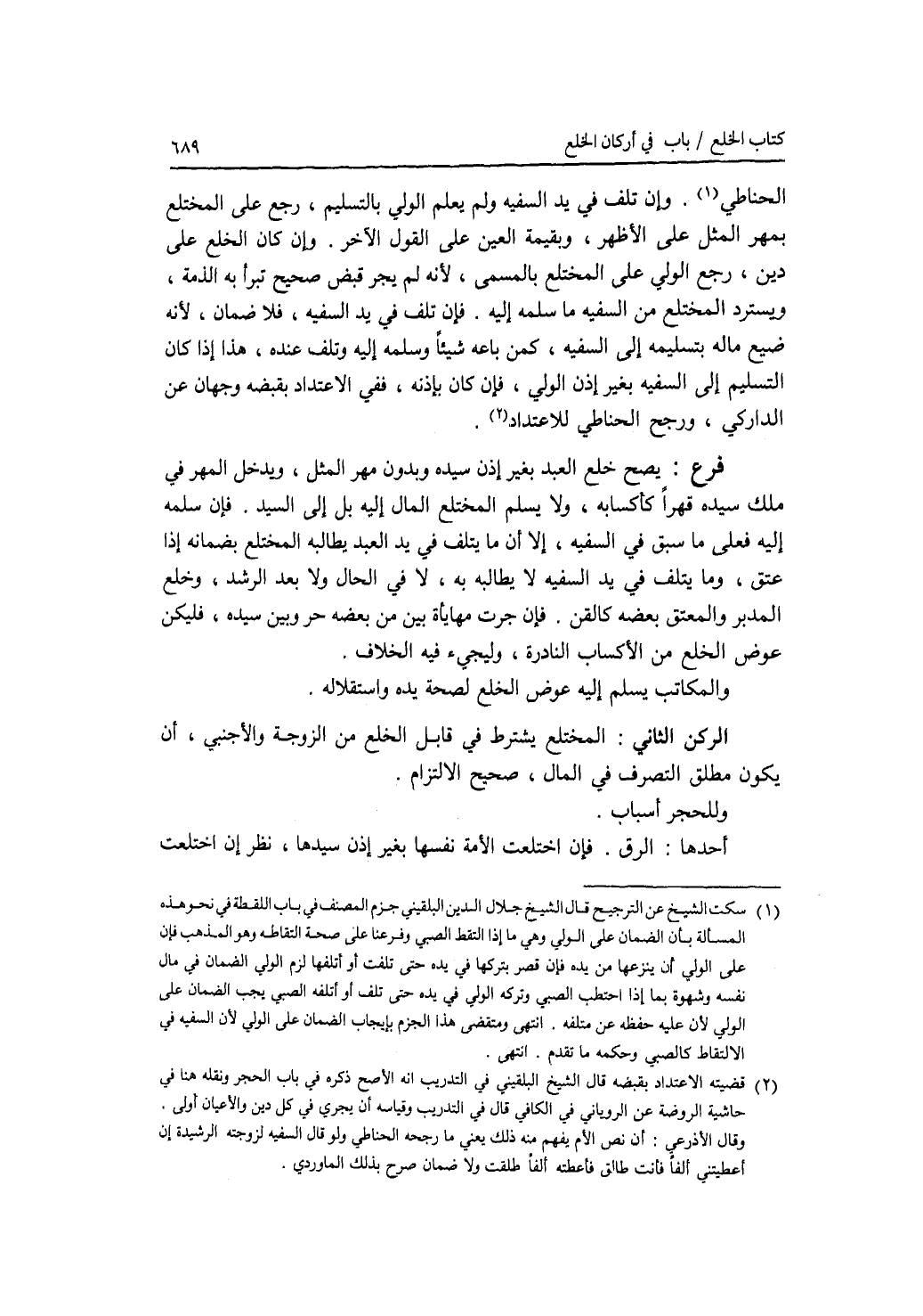 الركن الثاني : المختلع يشترط في قابل الخلع من الزوجة والأجنبي، أن يكون مطلق التصرف في المال، صحيح الالتزام. وللحجر أسباب. أحدها: الرق. فإن اختلعت الامة نفسها بغير إذن سيدها، نظر إن اختلعت