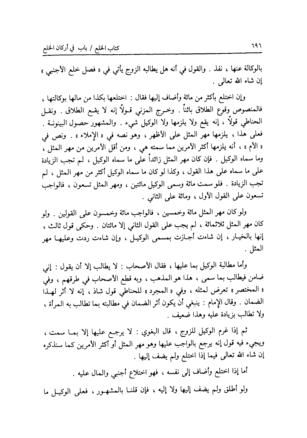 بالوكالة عنها، نفذ. والقول في أنه هل يطالبه الزوج يأتي في فصل خلع الاجنبي إن شاء الله تعالى. وإن اختلع بأكثر من مائة وأضا ف إليها فقال: اختلعها بكذا من مالها بوكالتها، فالمنصوص وقوع الطلاق بائنا. وخرج المزني قولا أنه لا يقع الطلاق. ونقل الحناطي قولا، أنه يقع ولا يلزمها ولا الوكيل شئ. والمشهور حصول البينونة. فعلى هذا، يلزمها مهر المثل على الاظهر، وهو نصه في الاملاء. ونص في الام، أنه يلزمها أكثر الامرين مما سمته هي، ومن أقل الامرين من مهر المثل، وما سماه الوكيل. فإن كان مهر المثل زائدا على ما سماه الوكيل، لم تجب الزيادة على ما سماه على هذا القول، وكذا لو كان ما سماه الوكيل أكثر من مهر المثل، لم تجب الزيادة. فلو سمت مائة وسمى الوكيل مائتين، ومهر المثل تسعون، فالواجب تسعون على القول الاول، ومائة على الثاني. ولو كان مهر المثل مائة وخمسين، فالواجب مائة وخمسون على القولين. ولو كان مهر المثل ثلاثمائة، لم يجب على القول الثاني إلا مائتان. وحكى قول ثالث، أنها بالخيار، إن شاءت أجازت بمسمى الوكيل، وإن شاءت ردت وعليها مهر المثل. وأما مطالبة الوكيل بما عليها، فقال الاصحاب: لا يطالب إلا أن يقول: إني ضامن فيطالب بما سمى، هذا هو المذهب، وبه قطع الاصحاب في طرقهم، وفي المختصر تعرض لمثله، وفي المجرد للحناطي قول شاذ، أنه لا أثر لهذا الضمان. وقال الامام: ينبغي أن يكون أثر الضمان في مطالبته بما تطالب به المرأة، ولا تطالب بزيادة عليه وهذا ضعيف. ثم إذا غرم الوكيل للزوج، قال البغوي: لا يرجع عليها إلا بما سمت، ويجئ فيه قول إنه يرجع بالواجب عليها وهو مهر المثل أو أكثر الامرين كما سنذكره إن شاء الله تعالى فيما إذا اختلع ولم يضف إليها. أما إذا اختلع وأضاف إلى نفسه، فهو اختلاع أجنبي والمال عليه. ولو أطلق ولم يضف إليها ولا إليه، فان قلنا بالمشهور، فعلى الوكيل ما