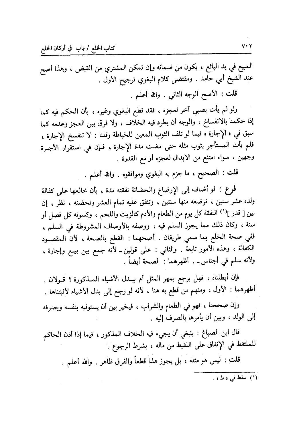 المبيع في يد البائع، يكون من ضمانه وإن تمكن المشتري من القبض، وهذا أصح عند الشيخ أبي حامد. ومقتضى كلام البغوي ترجيح الاول. قلت: الاصح الوجه الثاني. والله أعلم. ولو لم يأت بصبي آخر لعجزه، فقد قطع البغوي وغيره، بأن الحكم فيه (كما) إذا حكمنا بالانفساخ، والوجه أن يطرد فيه الخلاف، ولا فرق بين العجز وعدمه كما سبق في الاجارة فيما لو تلف الثوب المعين للخياطة وقلنا: لا تنفسخ الاجارة، فلم يأت المستأجر بثوب مثله حتى مضت مدة الاجارة، فإن في استقرار الاجرة وجهين، سواء امتنع من الابدال لعجزه أو مع القدرة. قلت: الصحيح، ما جزم به البغوي وموافقوه. والله أعلم. فرع لو أضاف إلى الارضاع والحضانة نفقته مدة، بأن خالعها على كفالة ولده عشر سنين، ترضعه منها سنتين، وتنفق عليه تمام العشر وتحضنه، نظر، إن بين النفقة كل يوم من الطعام والادم كالزيت واللحم، وكسوته كل فصل أو سنة، وكان ذلك مما يجوز السلم فيه، ووصفه بالاوصاف المشروطة في السلم، ففي صحة الخلع بما سمى طريقان. أصحهما: القطع بالصحة، لان المقصود الكفالة، وهذه الامور تابعة. والثاني: على قولين - لانه جمع بين بيع وإجارة، ولانه سلم في أجناس -. أظهرهما: الصحة أيضا. فإن أبطلناه، فهل يرجع بمهر المثل أم ببدل الاشياء المذكورة ؟ قولان. أظهرهما: الاول، ومنهم من قطع به هنا، لانه لو رجع إلى بدل الاشياء لاثبتناها. وإن صححنا، فهو في الطعام والشراب، فيخير بين أن يستوفيه بنفسه ويصرفه إلى الولد، وبين أن يأمرها بالصرف إليه. قال ابن الصباغ: ينبغي أن يجئ فيه الخلاف المذكور، فيما إذا أذن الحاكم للملتقط في الانفاق على اللقيط من ماله، بشرط الرجوع. قلت: ليس هو مثله، بل يجوز هذا قطعا والفرق ظاهر. والله أعلم.