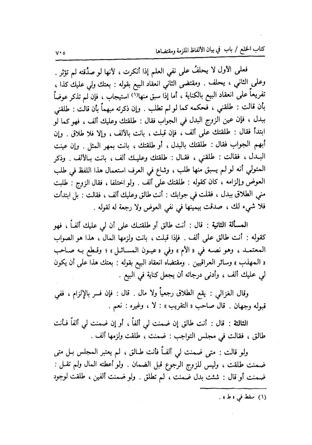 فعلى الاول لا يحلف على نفي العلم إذا أنكرت، لانها لو صدقته لم تؤثر. وعلى الثاني، يحلف. ومقتضى الثاني انعقاد البيع بقوله: بعتك ولي عليك (كذا)، تفريعا على انعقاد البيع بالكناية، أما إذا سبق استيجاب، فإن لم تذكر عوضا بأن قالت: طلقني، فحكمه كما لو لم تطلب. وإن ذكرته مبهما بأن قالت: طلقني ببدل، فإن عين الزوج البدل في الجواب فقال: طلقتك وعليك ألف، فهو كما لو ابتدأ فقال: طلقتك على ألف. فإن قبلت، بانت بالالف، وإلا فلا طلاق. وإن أبهم الجواب فقال: طلقتك بالبدل، أو طلقتك، بانت بمهر المثل. وإن عينت البدل، فقالت: طلقني، فقال: طلقتك وعليك ألف، بانت بالالف وذكر المتولي أنه لو لم يسبق منها طلب، وشاع في العرف استعمال هذا اللفظ في طلب العوض وإلزامه، كان كقوله: طلقتك على ألف. ولو اختلفا، فقال الزوج: طلبت مني الطلاق ببدل، فقلت في جوابك: أنت طالق وعليك ألف، فقالت: بل ابتدأت فلا شئ لك، صدقت بيمينها في نفي العوض ولا رجعة له لقوله. المسألة الثانية: قال: أنت طالق أو طلقتك على أن لي عليك ألفا، فهو كقوله: أنت طالق على ألف. فإذا قبلت، بانت ولزمها المال، هذا هو الصواب المعتمد، وهو نصه في الام وفي عيون المسائل، وقطع به صاحب المهذب وسائر العراقيين. ومقتضاه انعقاد البيع بقوله: بعتك هذا على أن يكون لي عليك ألف، وأدنى درجاته أن يجعل كناية في البيع. وقال الغزالي: يقع الطلاق رجعيا ولا مال. قال: فإن فسر بالالزام، ففي قبوله وجهان. قال صاحب التقريب: لا، وغيره: نعم. الثالثة: قال: أنت طالق إن ضمنت لي ألفا، أو إن ضمنت لي ألفا فأنت طالق، فقالت في مجلس التواجب: ضمنت، طلقت ولزمها ألف. ولو قالت: متى ضمنت لي ألفا فأنت طالق، لم يعتبر المجلس بل متى ضمنت طلقت، وليس للزوج الرجوع قبل الضمان. ولو أعطته المال ولم تقل: ضمنت أو قال: شئت بدل ضمنت، لم تطلق. ولو ضمنت ألفين، طلقت لوجود