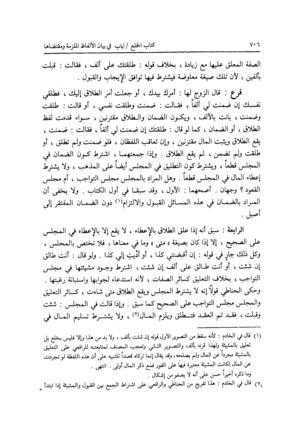 الصفة المعلق عليها مع زيادة، بخلاف قوله: طلقتك على ألف، فقالت: قبلت بألفين، لان تلك صيغة معاوضة فيشترط فيها توافق الايجاب والقبول. فرع قال الزوج لها: أمرك بيدك، أو جعلت أمر الطلاق إليك، فطلقي نفسك إن ضمنت لي ألفا، فقالت: ضمنت وطلقت نفسي، أو قالت: طلقت وضمنت، بانت بالالف، ويكون الضمان والطلاق مقترنين، سواء قدمت لفظ الطلاق، أو الضمان، كما لو قال: طلقتك إن ضمنت لي ألفا، فقالت: ضمنت، يقع الطلاق ويثبت المال مقترنين، وإن تعاقب اللفظان، فلو ضمنت ولم تطلق، أو طلقت ولم تضمن، لم يقع الطلاق. وإذا جمعتهما، اشترط كون الضمان في المجلس قطعا، ويشترط كون التطليق في المجلس أيضا على المذهب، ولا يشترط إعطاء المال في المجلس قطعا. وهل المراد بالمجلس مجلس التواجب، أم مجلس القعود ؟ وجهان. أصحهما: الاول، وقد سبقا في أول الكتاب. ولا يخفى أن المراد بالضمان في هذه المسائل القبول والالتزام دون الضمان المفتقر إلى أصيل. الرابعة: سبق أنه إذا علق الطلاق بالاعطاء، لا يقع إلا بالاعطاء في المجلس على الصحيح، إلا إذا كان بصيغة متى وما في معناها، فلا تختص بالمجلس، وكل ذلك جار في قوله: إن أقبضتيني كذا، أو أديت إلي كذا. ولو قال: أنت طالق إن شئت، أو أنت طالق على ألف إن شئت، اشترط وجود مشيئتها في مجلس التواجب، بخلاف التعليق كسائر الصفات، لانه استدعاء لجوابها واستبانة رغبتها. وحكى الحناطي قولا أنه لا يشترط المجلس ويقع الطلاق متى شاءت، كسائر التعليق والمجلس مجلس التواجب على الصحيح كما سبق. وإذا قالت في المجلس: شئت وقبلت، فقد تم العقد فتطلق ويلزم المال، ولا يشترط تسليم المال في
