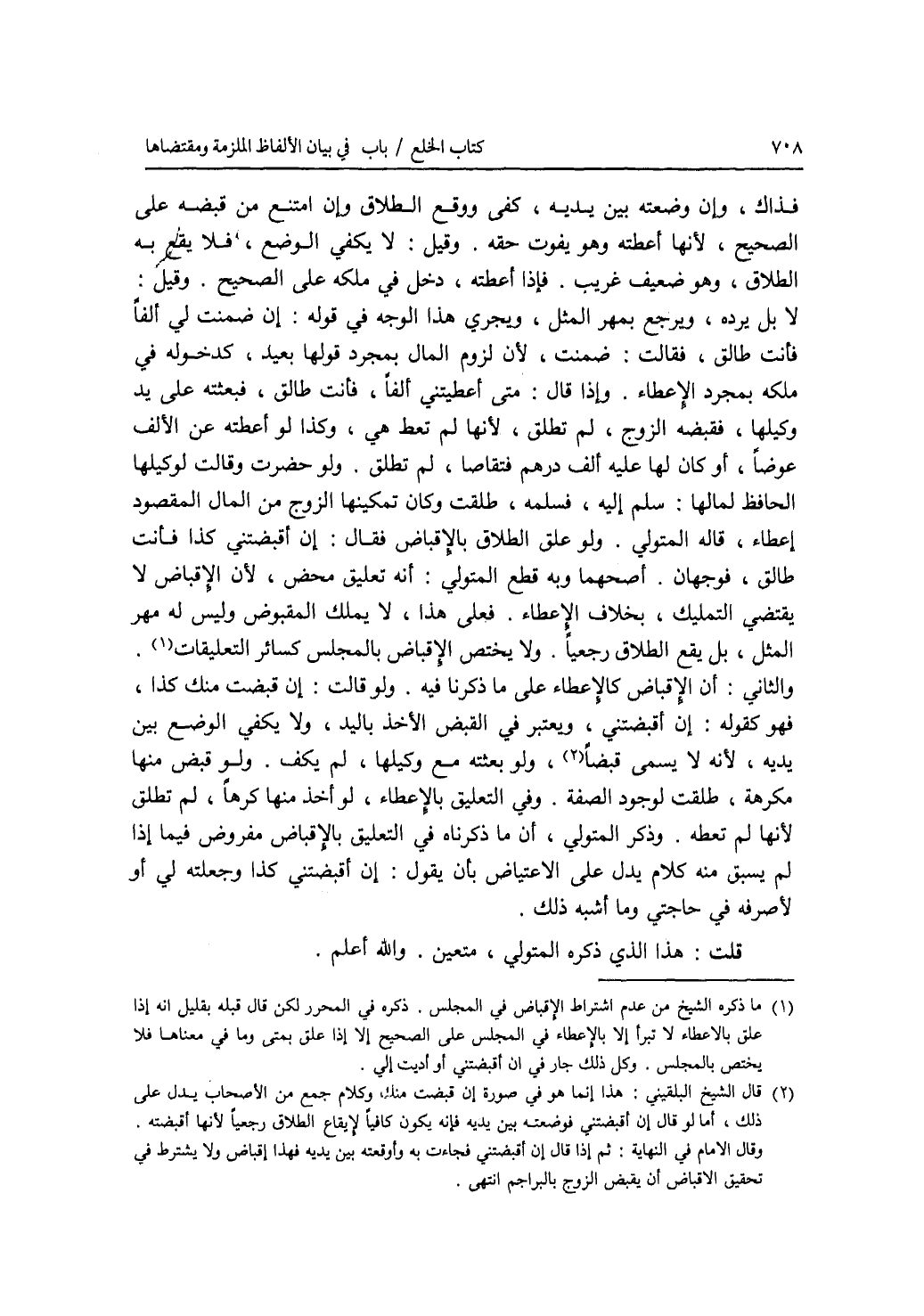 فذاك، وإن وضعته بين يديه، كفى ووقع الطلاق وإن امتنع من قبضه على الصحيح، لانها أعطته وهو يفوت حقه. وقيل: لا يكفي الوضع، فلا يقع به الطلاق، وهو ضعيف غريب. فإذا أعطته، دخل في ملكه على الصحيح. وقيل: لا بل يرده، ويرجع بمهر المثل، ويجري هذا الوجه في قوله: إن ضمنت لي ألفا فأنت طالق، فقالت: ضمنت، لان لزوم المال بمجرد قولها بعيد، كدخوله في ملكه بمجرد الاعطاء. وإذا قال: متى أعطيتني ألفا، فأنت طالق، فبعثته على يد وكيلها، فقبضه الزوج، لم تطلق، لانها لم تعط هي، وكذا لو أعطته عن الالف عوضا، أو كان لها عليه ألف درهم فتقاصا، لم تطلق. ولو حضرت وقالت لوكيلها الحافظ لمالها: سلم إليه، فسلمه، طلقت وكان تمكينها الزوج من المال المقصود إعطاء، قاله المتولي. ولو علق الطلاق بالاقباض فقال: إن أقبضتني كذا فأنت طالق، فوجهان. أصحهما وبه قطع المتولي: أنه تعليق محض، لان الاقباض لا يقتضي التمليك، بخلاف الاعطاء. فعلى هذا، لا يملك المقبوض وليس له مهر المثل، بل يقع الطلاق رجعيا. ولا يختص الاقباض بالمجلس كسائر التعليقات. والثاني: أن الاقباض كالاعطاء على ما ذكرنا فيه. ولو قالت: إن قبضت منك كذا، فهو كقوله: إن أقبضتني، ويعتبر في القبض الاخذ باليد، ولا يكفي الوضع بين يديه، لانه لا يسمى قبضا، ولو بعثته مع وكيلها، لم يكف. ولو قبض منها مكرهة، طلقت لوجود الصفة. وفي التعليق بالاعطاء، لو أخذ منها كرها، لم تطلق لانها لم تعطه. وذكر المتولي، أن ما ذكرناه في التعليق بالاقباض مفروض فيما إذا لم يسبق منه كلام يدل على الاعتياض بأن يقول: إن أقبضتني كذا وجعلته لي أو لاصرفه في حاجتي وما أشبه ذلك. قلت: هذا الذي ذكره المتولي، متعين. والله أعلم.