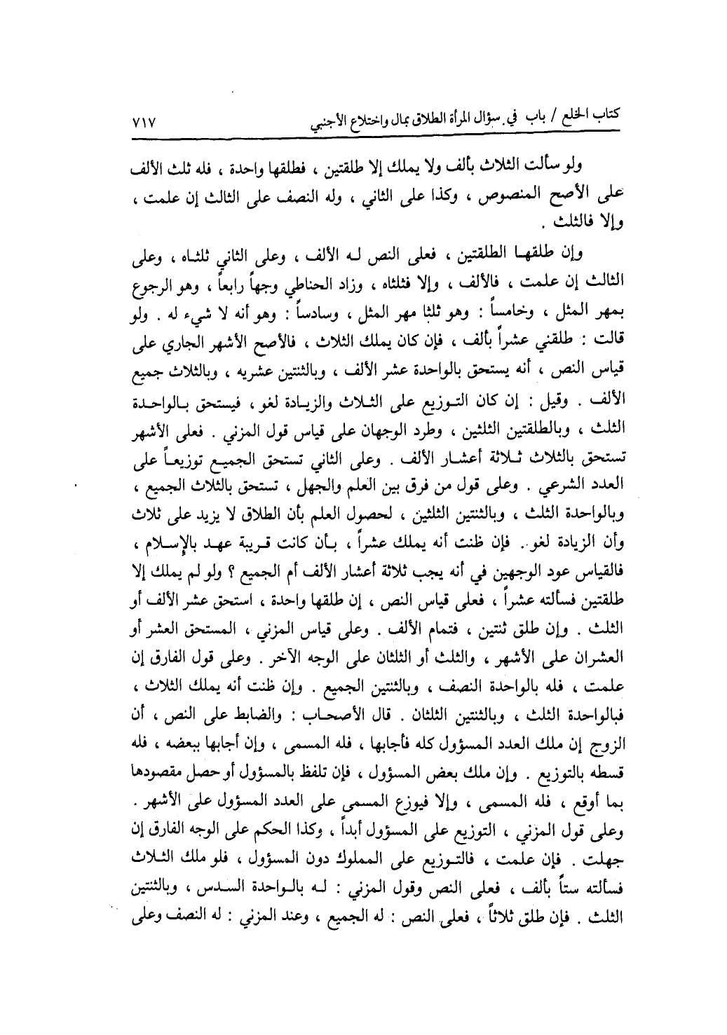 ولو سألت الثلاث بألف ولا يملك إلا طلقتين، فطلقها واحدة، فله ثلث الالف على الاصح المنصوص، وكذا على الثاني، وله النصف على الثالث إن علمت، وإلا فالثلث. وإن طلقها الطلقتين، فعلى النص له الالف، وعلى الثاني ثلثاه، وعلى الثالث إن علمت، فالالف، وإلا فثلثاه، وزاد الحناطي وجها رابعا، وهو الرجوع بمهر المثل، وخامسا: وهو ثلثا مهر المثل، وسادسا: وهو أنه لا شئ له. ولو قالت: طلقني عشرا بألف، فإن كان يملك الثلاث، فالاصح الاشهر الجاري على قياس النص، أنه يستحق بالواحدة عشر الالف، وبالثنتين عشريه، وبالثلاث جميع الالف. وقيل: إن كان التوزيع على الثلاث والزيادة لغو، فيستحق بالواحدة الثلث، وبالطلقتين الثلثين، وطرد الوجهان على قياس قول المزني. فعلى الاشهر تستحق بالثلاث ثلاثة أعشار الالف. وعلى الثاني تستحق الجميع توزيعا على العدد الشرعي. وعلى قول من فرق بين العلم والجهل، تستحق بالثلاث الجميع، وبالواحدة الثلث، وبالثنتين الثلثين، لحصول العلم بأن الطلاق لا يزيد على ثلاث وأن الزيادة لغو. فإن ظنت أنه يملك عشرا، بأن كانت قريبة عهد بالاسلام، فالقياس عود الوجهين في أنه يجب ثلاثة أعشار الالف أم الجميع ؟ ولو لم يملك إلا طلقتين فسألته عشرا، فعلى قياس النص، إن طلقها واحدة، استحق عشرالالف أو الثلث. وإن طلق ثنتين، فتمام الالف. وعلى قياس المزني، المستحق العشر أو العشران على الاشهر، والثلث أو الثلثان على الوجه الآخر. وعلى قول الفارق إن علمت، فله بالواحدة النصف، وبالثنتين الجميع. وإن ظنت أنه يملك الثلاث، فبالواحدة الثلث، وبالثنتين الثلثان. قال الاصحاب: والضابط على النص، أن الزوج إن ملك العدد المسؤول كله فأجابها، فله المسمى، وإن أجابها ببعضه، فله قسطه بالتوزيع. وإن ملك بعض المسؤول، فإن تلفظ بالمسؤول أو حصل مقصودها بما أوقع، فله المسمى، وإلا فيوزع المسمى على العدد المسؤول على الاشهر. وعلى قول المزني، التوزيع على المسؤول أبدا، وكذا الحكم على الوجه الفارق إن جهلت. فإن علمت، فالتوزيع على المملوك دون المسؤول، فلو ملك الثلاث فسألته ستا بألف، فعلى النص وقول المزني: له بالواحدة السدس، بالثنتين الثلث. فإن طلق ثلاثا، فعلى النص: له الجميع، وعند المزني: له النصف وعلى