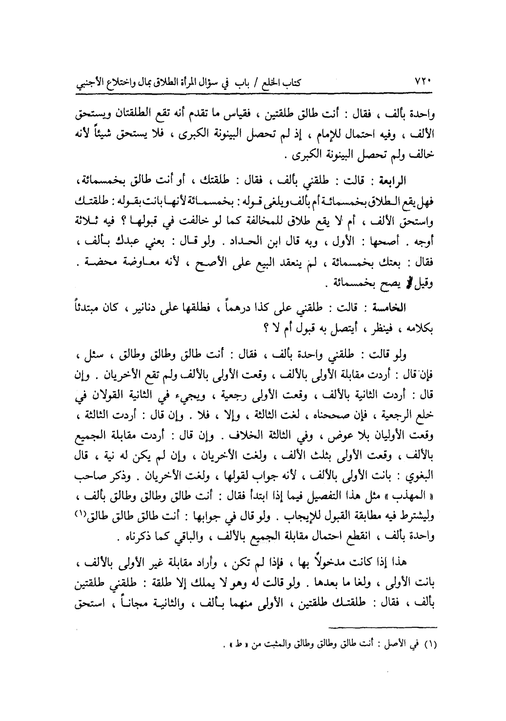 واحدة بألف، فقال: أنت طالق طلقتين، فقياس ما تقدم أنه تقع الطلقتان ويستحق الالف، وفيه احتمال للامام، إذ لم تحصل البينونة الكبرى، فلا يستحق شيئا لانه خالف ولم تحصل البينونة الكبرى. الرابعة: قالت: طلقني بألف، فقال: طلقتك، أو أنت طالق بخمسمائة، فهل يقع الطلاق بخمسمائة أم بألف ويلغى قوله: بخمسمائة لانها بانت بقوله: طلقتك واستحق الالف، أم لا يقع طلاق للمخالفة كما لو خالفت في قبولها ؟ فيه ثلاثة أوجه. أصحها: الاول، وبه قال ابن الحداد. ولو قال: بعني عبدك بألف، فقال: بعتك بخمسمائة، لم ينعقد البيع على الاصح، لانه معاوضة محضة. وقيل: يصح بخمسمائة. الخامسة: قالت: طلقني على كذا درهما، فطلقها على دنانير، كان مبتدئا بكلامه، فينظر، أيتصل به قبول أم لا ؟ ولو قالت: طلقني واحدة بألف، فقال: أنت طالق وطالق وطالق، سئل، فإن قال: أردت مقابلة الاولى بالالف، وقعت الاولى بالالف ولم تقع الاخريان. وإن قال: أردت الثانية بالالف، وقعت الاولى رجعية، ويجئ في الثانية القولان في خلع الرجعية، فإن صححناه، لغت الثالثة، وإلا، فلا. وإن قال: أردت الثالثة، وقعت الاوليان بلا عوض، وفي الثالثة الخلاف. وإن قال: أردت مقابلة الجميع بالالف، وقعت الاولى بثلث الالف، ولغت الاخريان، وإن لم يكن له نية، قال البغوي: بانت الاولى بالالف، لانه جواب لقولها، ولغت الاخريان. وذكر صاحب المهذب مثل هذا التفصيل فيما إذا ابتدأ فقال: أنت طالق وطالق وطالق بألف، وليشترط فيه مطابقة القبول للايجاب. ولو قال في جوابها: أنت طالق طالق طالق واحدة بألف، انقطع احتمال مقابلة الجميع بالالف، والباقي كما ذكرناه. هذا إذا كانت مدخولا بها، فإذا لم تكن، وأراد مقابلة غير الاولى بالالف، بانت الاولى، ولغا ما بعدها. ولو قالت له وهو لا يملك إلا طلقة: طلقني طلقتين بألف، فقال: طلقتك طلقتين، الاولى منهما بألف، والثانية مجانا، استحق