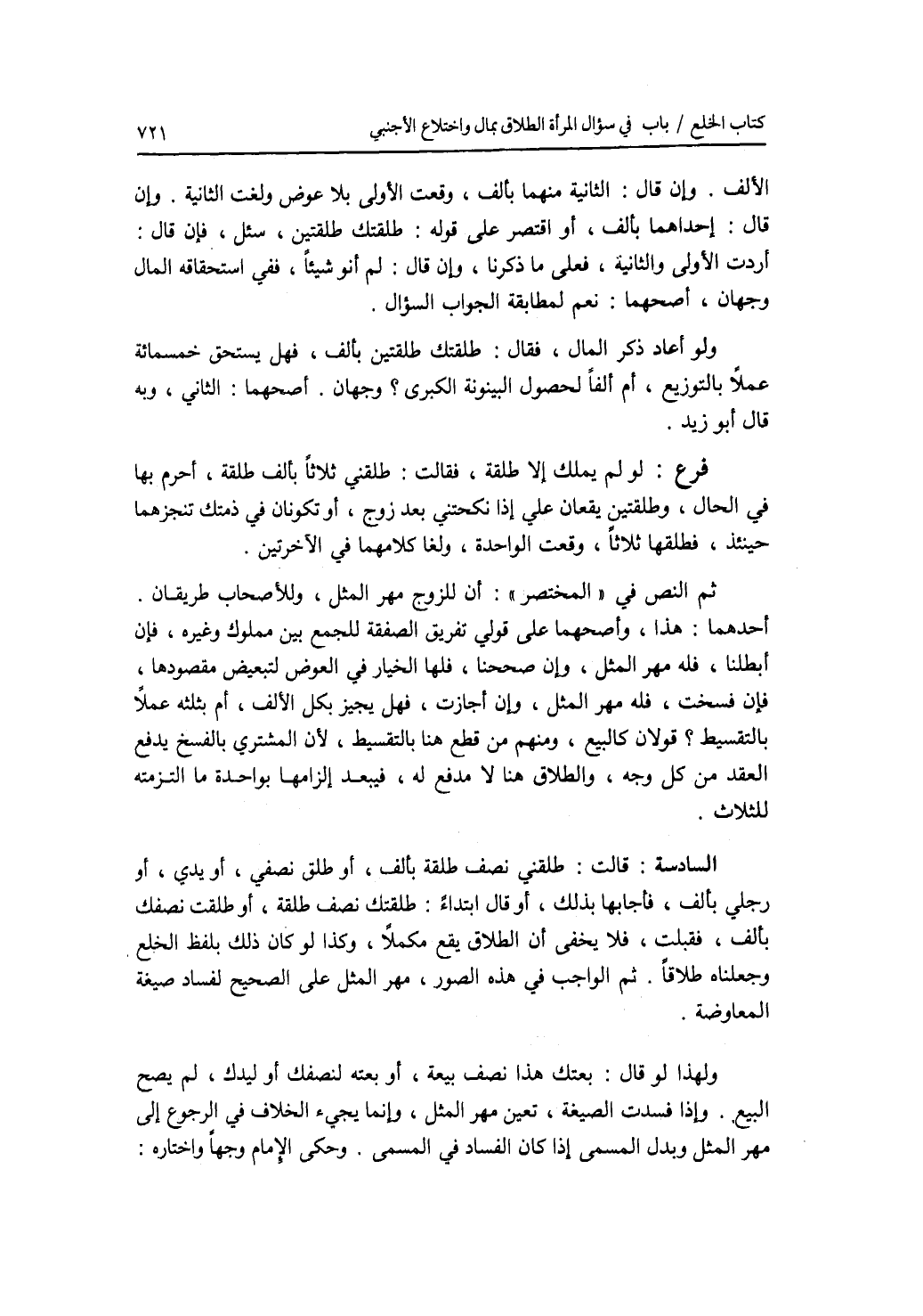 الالف. وإن قال: الثانية منهما بألف، وقعت الاولى بلا عوض ولغت الثانية. وإن قال: إحداهما بألف، أو اقتصر على قوله: طلقتك طلقتين، سئل، فإن قال: أردت الاولى والثانية، فعلى ما ذكرنا، وإن قال: لم أنو شيئا، ففي استحقاقه المال وجهان، أصحهما: نعم لمطابقة الجواب السؤال. ولو أعاد ذكر المال، فقال: طلقتك طلقتين بألف، فهل يستحق خمسمائة عملا بالتوزيع، أم ألفا لحصول البينونة الكبرى ؟ وجهان. أصحهما: الثاني، وبه قال أبو زيد. فرع لو لم يملك إلا طلقة، فقالت: طلقني ثلاثا بألف طلقة، أحرم بها في الحال، وطلقتين يقعان علي إذا نكحتني بعد زوج، أو تكونان في ذمتك تنجزهما حينئذ، فطلقها ثلاثا، وقعت الواحدة، ولغا كلامهما في الآخرتين. ثم النص في المختصر: أن للزوج مهر المثل، وللاصحاب طريقان. أحدهما: هذا، وأصحهما على قولي تفريق الصفقة للجمع بين مملوك وغيره، فإن أبطلنا، فله مهر المثل، وإن صححنا، فلها الخيار في العوض لتبعيض مقصودها، فإن فسخت، فله مهر المثل، وإن أجازت، فهل يجيز بكل الالف، أم بثلثه عملا بالتقسيط ؟ قولان كالبيع، ومنهم مق قطع هنا بالتقسيط، لان المشتري بالفسخ يدفع العقد من كل وجه، والطلاق هنا لا مدفع له، فيبعد إلزامها بواحدة ما التزمته للثلاث. السادسة: قالت: طلقني نصف طلقة بألف، أو طلق نصفي، أو يدي، أو رجلي بألف، فأجابها بذلك، أو قال ابتداء: طلقتك نصف طلقة، أو طلقت نصفك بألف، فقبلت، فلا يخفى أن الطلاق يقع مكملا، وكذا لو كان ذلك بلفظ الخلع وجعلناه طلاقا. ثم الواجب في هذه الصور، مهر المثل على الصحيح لفساد صيغة المعاوضة. ولهذا لو قال: بعتك هذا نصف بيعة، أو بعته لنصفك أو ليدك، لم يصح البيع. وإذا فسدت الصيغة، تعين مهر المثل، وإنما يجئ الخلاف في الرجوع إلى مهر المثل وبدل المسمى إذا كان الفساد في المسمى. وحكى الامام وجها واختاره: