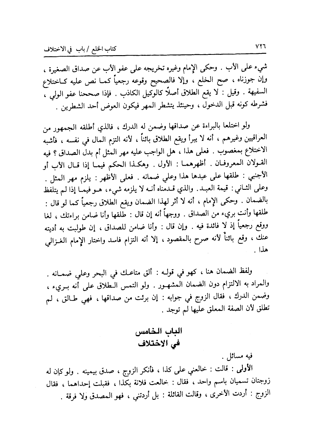الباب الخامس : في الاختلاف فيه مسائل. الاولى: قالت: خالعني على كذا، فأنكر الزوج، صدق بيمينه. ولو كان له زوجتان تسميان باسم واحد، فقال: خالعت فلانة بكذا، فقبلت إحداهما، فقال الزوج: أردت الاخرى، وقالت القائلة: بل أردتني، فهو المصدق ولا فرقة.