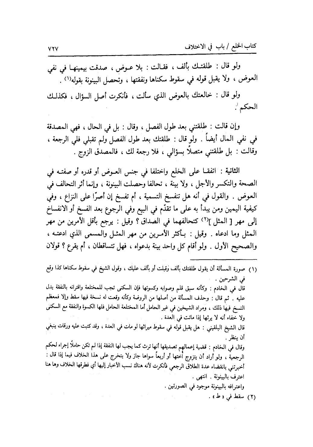 الثانية : اتفقا على الخلع واختلفا في جنس العوض أو قدره أو صفته في الصحة والتكسر والاجل، ولا بينة، تحالفا وحصلت البينونة، وإنما أثر التحالف في العوض. والقول في أنه هل تنفسخ التسمية، أم تفسخ إن أصرا على النزاع، وفي كيفية اليمين ومن يبدأ به على ما تقدم في البيع وفي الرجوع بعد الفسخ أو الانفساخ إلى مهر كتحالفهما في الصداق ؟ وقيل: يرجع بأقل الامرين من مهر المثل وما ادعاه. وقيل: بأكثر الامرين من مهر المثل والمسمى الذي ادعته، والصحيح الاول. ولو أقام كل واحد بينة بدعواه، فهل تتساقطان، أم يقرع ؟ قولان