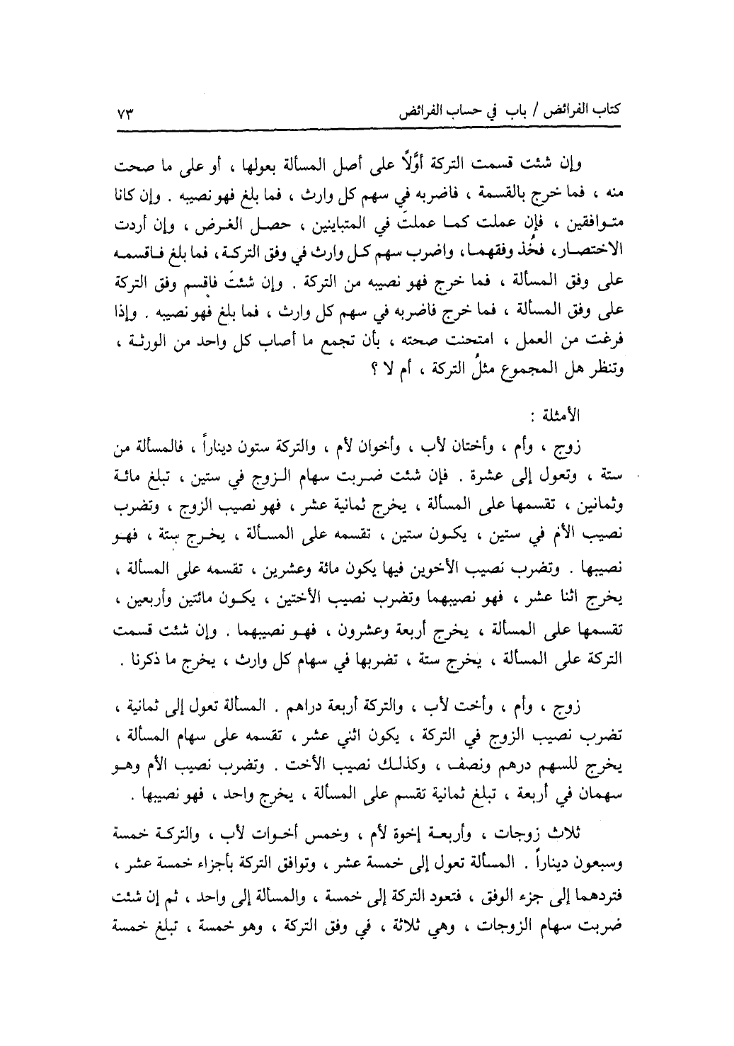 وإن شئت قسمت التركة أولا على أصل المسألة بعولها، أو على ما صحت منه، فما خرج بالقسمة، فاضربه في سهم كل وارث، فما بلغ فهو نصيبه. وإن كانا متوافقين، فان عملت كما عملت في المتباينين، حصل الغرض، وإن أردت الاختصار، فخذ وفقهما، واضرب سهم كل وارث في وفق التركة، فما بلغ فاقسمه على وفق المسألة، فما خرج فهو نصيبه من التركة. وإن شئت فاقسم وفق التركة على وفق المسألة، فما خرج فاضربه في سهم كل وارث، فما بلغ فهو نصيبه. وإذا فرغت من العمل، امتحنت صحته، بأن تجمع ما أصاب كل واحد من الورثة، وتنظر هل المجموع مثل التركة، أم لا ؟ الامثلة: زوج، وأم، وأختان لاب، وأخوان لام، والتركة ستون دينارا، فالمسألة من ستة، وتعول إلى عشرة. فان شئت ضربت سهام الزوج في ستين، تبلغ مائة وثمانين، تقسمها على المسألة، يخرج ثمانية عشر، فهو نصيب الزوج، وتضرب نصيب الام في ستين، يكون ستين، تقسمه على المسألة، يخرج ستة، فهو نصيبها. وتضرب نصيب الاخوين فيها يكون مائة وعشرين، تقسمه على المسألة يخرج اثنا عشر، فهو نصيبهما وتضرب نصيب الاختين، يكون مائتين وأربعين، تقسمها على المسألة، يخرج أربعة وعشرون، فهو نصيبهما. وإن شئت قسمت التركة على المسألة، يخرج ستة، تضربها في سهام كل وارث، يخرج ما ذكرنا. زوج، وأم، وأخت لاب، والتركة أربعة دراهم. المسألة تعول إلى ثمانية، تضرب نصيب الزوج في التركة، يكون اثني عشر، تقسمه على سهام المسألة، يخرج للسهم درهم ونصف، وكذلك نصيب الاخت. وتضرب نصيب الام وهو سهمان في أربعة، تبلغ ثمانية تقسم على المسألة، يخرج واحد، فهو نصيبها. ثلاث زوجات، وأربعة إخوة لام، وخمس أخوات لاب، والتركة خمسة وسبعون دينارا. المسألة تعول إلى خمسة عشر، وتوافق التركة بأجزاء خمسة عشر، فتردهما إلى جزء الوفق، فتعود التركة إلى خمسة، والمسألة إلى واحد، ثم إن شئت ضربت سهام الزوجات، وهي ثلاثة، في وفق التركة، وهو خمسة، تبلغ خمسة
