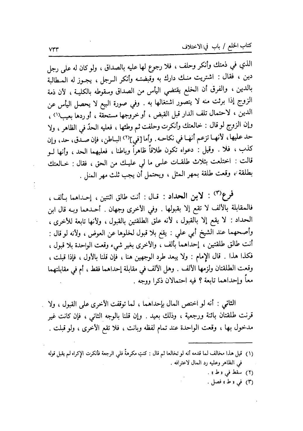 الذي في ذمتك وأنكر وحلف، فلا رجوع لها عليه بالصداق ولو كان له على رجل دين، فقال: اشتريت منك دارك به وقبضته وأنكر الرجل، يجوز له المطالبة بالدين، والفرق أن الخلع يقتضي اليأس من الصداق وسقوطه بالكلية، لان ذمة الزوج إذا برئت منه لا يتصور اشتغالها به. وفي صورة البيع لا يحصل اليأس عن الدين، لاحتمال تلف الدار قبل القبض، أو خروجها مستحقة، أو ردها بعيب، وإن الزوج لو قال: خالعتك وأنكرت وحلفت ثم وطئها، فعليه الحد في الظاهر، ولا حد عليها، لانها تزعم أنها في نكاحه. وأما الباطن، فإن صدق، حد، وإن كذب، فلا. وقيل: دعواه تكون طلاقا ظاهرا وباطنا، فعليهما الحد، وأنها لو قالت: اختلعت بثلاث طلقات على ما لي عليك من الحق، فقال: خالعتك بطلقة، وقعت طلقة بمهر المثل، ويحتمل أن يجب ثلث مهر المثل. فصل لابن الحداد قال: أنت طالق اثنتين، احداهما بألف، فالمقابلة بالالف لا تقع إلا بقبولها. وفي الاخرى وجهان. أحدهما وبه قال ابن الحداد: لا يقع إلا بالقبول، لانه علق الطلقتين بالقبول، ولانها تابعة للاخرى، وأصحهما عند الشيخ أبي علي: يقع بلا قبول لخلوها عن العوض، ولانه لو قال: أنت طالق طلقتين، إحداهما بألف، والاخرى بغير شئ وقعت الواحدة بلا قبول، فكذا هذا. قال الامام: ولا يبعد طرد الوجهين هنا، فإن قلنا بالاول، فإذا قبلت، وقعت الطلقتان ولزمها الالف. وهل الالف في مقابلة إحداهما فقط، أم في مقابلتهما الدين، لاحتمال تلف الدار قبل القبض، أو خروجها مستحقة، أو ردها بعيب، وإن الزوج لو قال: خالعتك وأنكرت وحلفت ثم وطئها، فعليه الحد في الظاهر، ولا حد عليها، لانها تزعم أنها في نكاحه. وأما الباطن، فإن صدق، حد، وإن كذب، فلا. وقيل: دعواه تكون طلاقا ظاهرا وباطنا، فعليهما الحد، وأنها لو قالت: اختلعت بثلاث طلقات على ما لي عليك من الحق، فقال: خالعتك بطلقة، وقعت طلقة بمهر المثل، ويحتمل أن يجب ثلث مهر المثل. فصل لابن الحداد قال: أنت طالق اثنتين، احداهما بألف، فالمقابلة بالالف لا تقع إلا بقبولها. وفي الاخرى وجهان. أحدهما وبه قال ابن الحداد: لا يقع إلا بالقبول، لانه علق الطلقتين بالقبول، ولانها تابعة للاخرى، وأصحهما عند الشيخ أبي علي: يقع بلا قبول لخلوها عن العوض، ولانه لو قال: أنت طالق طلقتين، إحداهما بألف، والاخرى بغير شئ وقعت الواحدة بلا قبول، فكذا هذا. قال الامام: ولا يبعد طرد الوجهين هنا، فإن قلنا بالاول، فإذا قبلت، وقعت الطلقتان ولزمها الالف. وهل الالف في مقابلة إحداهما فقط، أم في مقابلتهما معا وإحداهما تابعة ؟ فيه احتمالان ذكرا ووجه. الثاني: أنه لو اختص المال باحداهما، لما توقفت الاخرى على القبول، ولا قرنت طلقتان بائنة ورجعية، وذلك بعيد. وإن قلنا بالوجه الثاني، فإن كانت غير مدخول بها، وقعت الواحدة عند تمام لفظه وبانت، فلا تقع الاخرى، ولو قبلت.