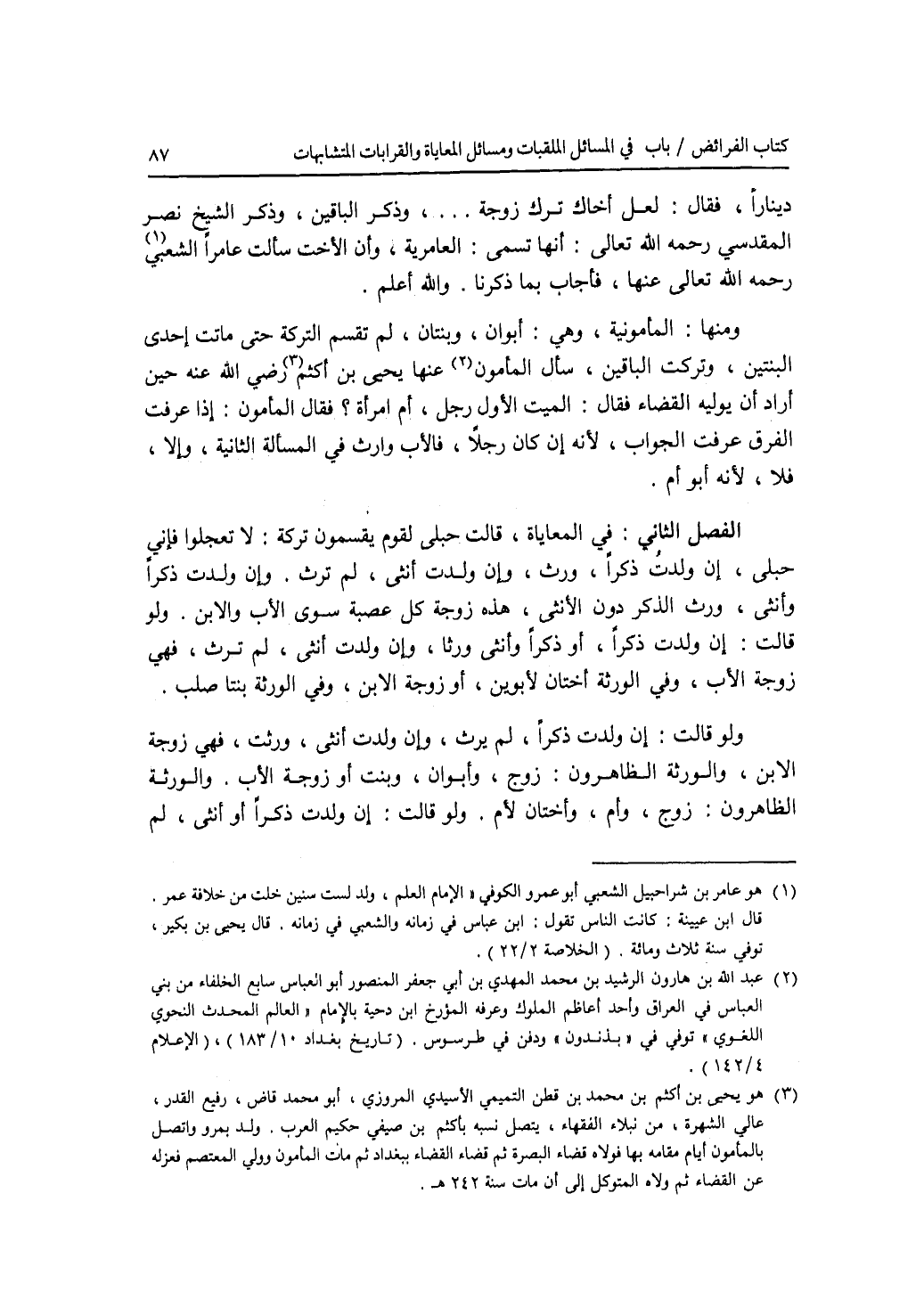 دينارا، فقال: لعل أخاك ترك زوجة...، وذكر الباقين، وذكر الشيخ نصر المقدسي رحمه الله تعالى: أنها تسمى: العامرية، وأن الاخت سألت عامرا الشعبي رحمه الله تعالى عنها، فأجاب بما ذكرنا. والله أعلم. ومنها: المأمونية، وهي: أبوان، وبنتان، لم تقسم التركة حتى ماتت إحدى البنتين، وتركت الباقين، سأل المأمون عنها يحيى بن أكثم رضي الله عنه حين أراد أن يوليه القضاء فقال: الميت الاول رجل، أم امرأة ؟ فقال المأمون: إذا عرفت الفرق عرفت الجواب، لانه إن كان رجلا، فالا ب وارث في المسألة الثانية، وإلا، فلا، لانه أبو أم.