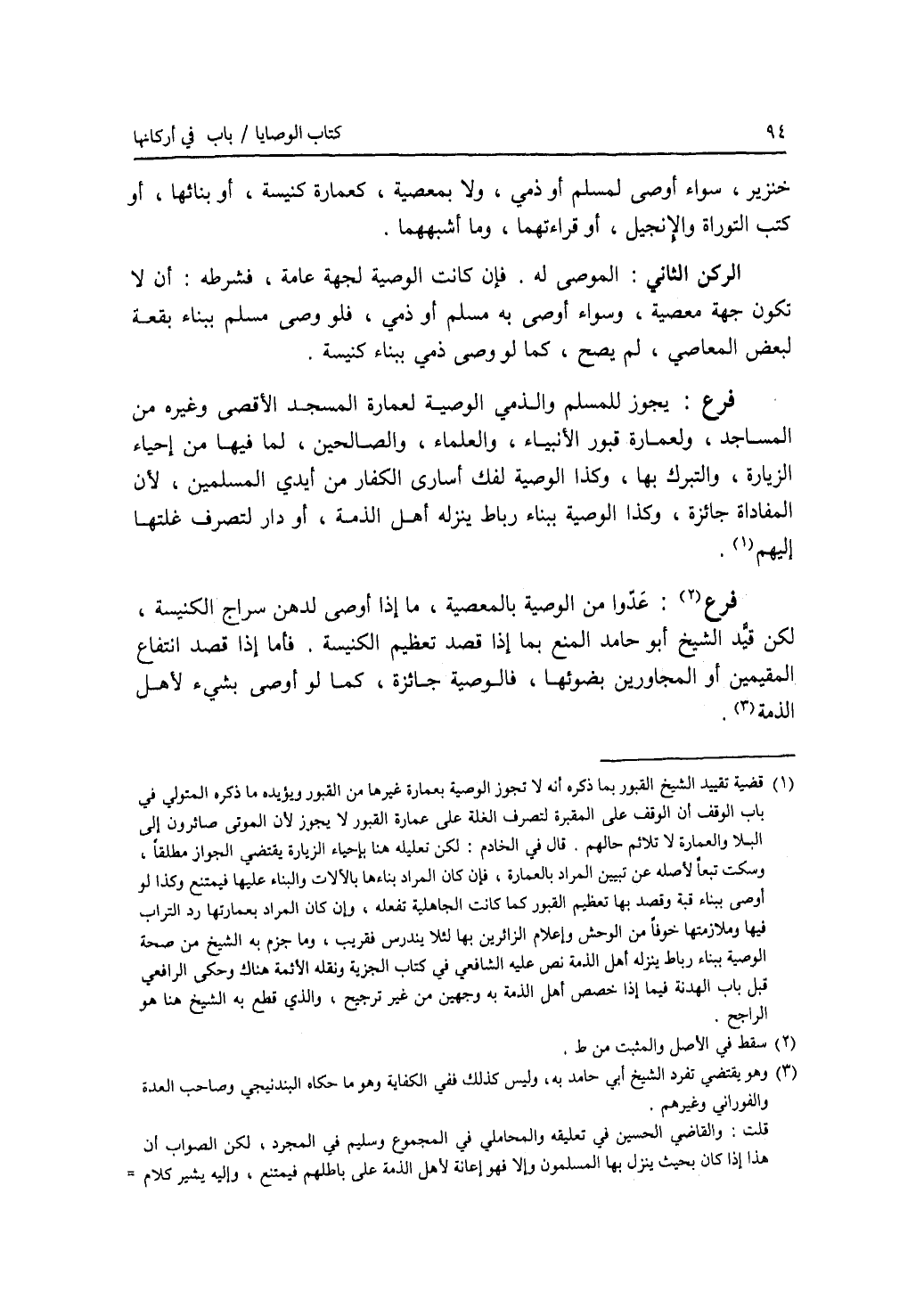 الركن الثاني : الموصى له. فإن كانت الوصية لجهة عامة، فشرطه: أن لا تكون جهة معصية وسواء أوصى به مسلم أو ذمي، فلو وصى مسلم ببناء بقعة لبعض المعاصي، لم يصح، كما لو وصى ذمي ببناء كنيسة. فرع يجوز للمسلم والذمي الوصية لعمارة المسجد الاقصى وغير من المساجد، ولعمارة قبور الانبياء، والعلماء، والصالحين، لما فيها من إحياء الزيارة، والتبرك بها، وكذا الوصية لفك أسارى الكفار من أيدي المسلمين، لان المفاداة جائزة، وكذا الوصية ببناء رباط ينزله أهل الذمة، أو دار لتصرف غلتها إليهم. فرع عدوا من الوصية بالمعصية، ما إذا أوصى لدهن سراج الكنيسة، لكن قيد الشيخ أبو حامد المنع بما إذا قصد تعظيم الكنيسة. فأما إذا قصد انتفاع المقيمين أو المجاورين بضوئها، فالوصية جائزة، كما لو أوصى بشئ لاهل الذمة.