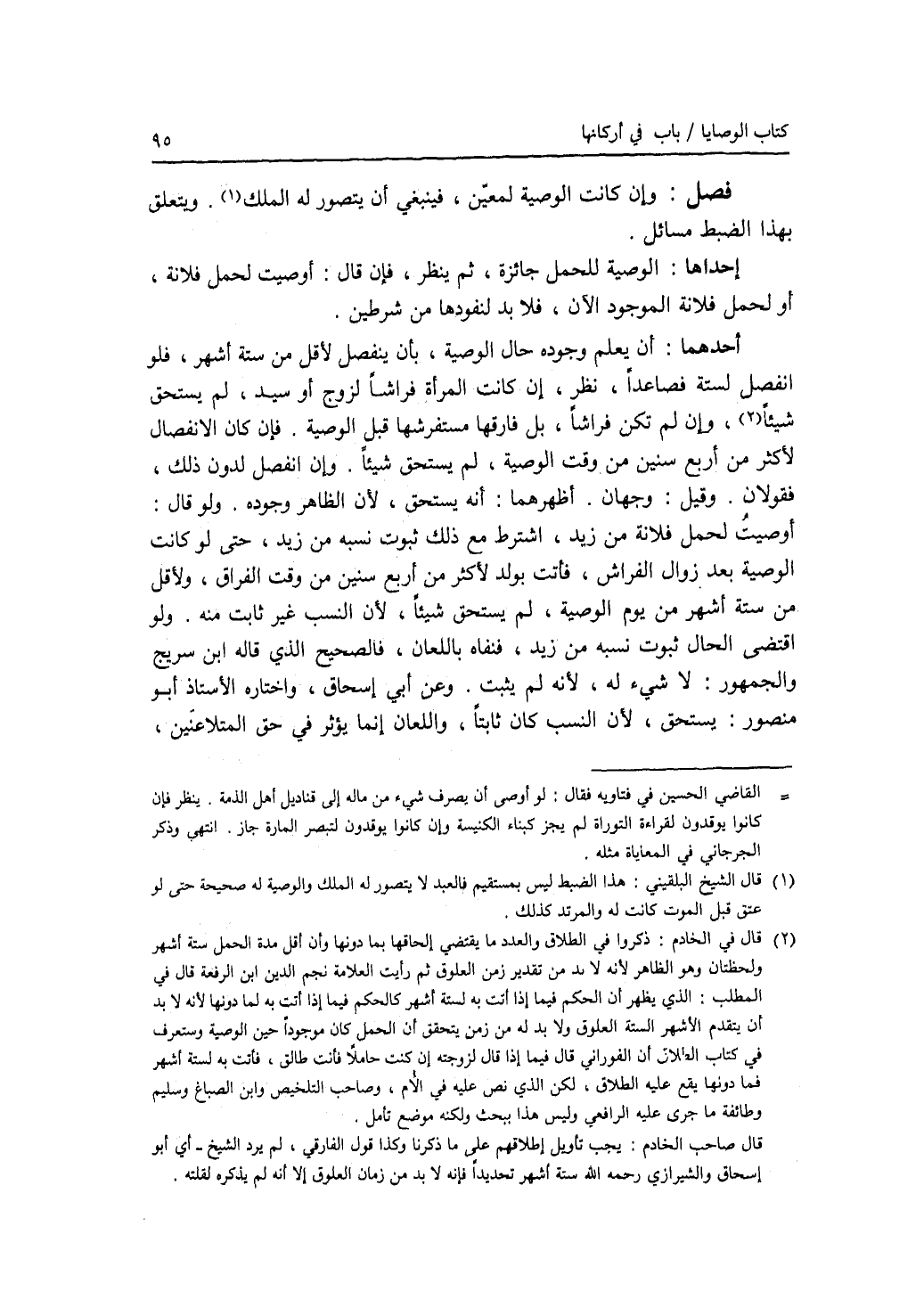 فصل وإن كانت الوصية لمعين، فينبغي أن يتصور له الملك. ويتعلق بهذا الضبط مسائل. إحداها: الوصية للحمل جائزة، ثم ينظر، فإن قال: أوصيت لحمل فلانة، أو لحمل فلانة الموجود الآن، فلا بد لنفوذها من شرطين. أحدهما: أن يعلم وجوده حال الوصية، بأن ينفصل لاقل من ستة أشهر، فلو انفصل لستة فصاعدا، نظر، إن كانت المرأة فراشا لزوج أو سيد، لم يستحق شيئا، وان لم تكن فراشا، بل فارقها مستفرشها قبل الوصية. فان كان الانفصال لاكثر من أربع سنين من وقت الوصية، لم يستحق شيئا. وإن انفصل لدون ذلك، فقولان، وقيل: وجهان. أظهرهما: أنه يستحق، لان الظاهر وجوده. ولو قال: أوصيت لحمل فلانة من زيد، اشترط مع ذلك ثبوت نسبه من زيد حتى لو كانت الوصية بعد زوال الفراش، فأتت بولد لاكثر من أربع سنين من وقت الفراق، ولاقل من ستة أشهر من يوم الوصية، لم يستحق شيئا، لان النسب غير ثابت منه. ولو اقتضى الحال ثبوت نسبه من زيد، فنفاه باللعان، فالصحيح الذي قاله ابن سريج والجمهور: لا شئ له، لانه لم يثبت. وعن أبي إسحق، واختاره الاستاذ أبو منصور: يستحق، لان النسب كان ثابتا، واللعان إنما يؤثر في حق المتلاعنين،