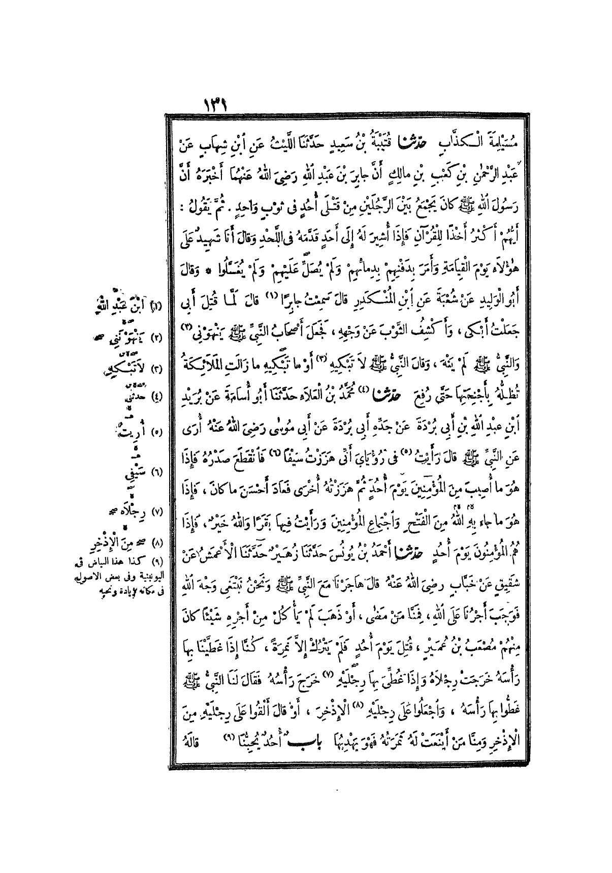 4079- حَدَّثَنَا قُتَيْبَةُ بْنُ سَعِيدٍ ، حَدَّثَنَا اللَّيْثُ ، عَنِ ابْنِ شِهَابٍ ، عَنْ عَبْدِ الرَّحْمَنِ بْنِ كَعْبِ بْنِ مَالِكٍ ، أَنَّ جَابِرَ بْنَ عَبْدِ اللهِ ، رَضِيَ اللَّهُ عَنْهُمَا ، أَخْبَرَهُ , أَنَّ رَسُولَ اللهِ صَلَّى اللَّهُ عَلَيْهِ وَسَلَّمَ كَانَ يَجْمَعُ بَيْنَ الرَّجُلَيْنِ مِنْ قَتْلَى أُحُدٍ فِي ثَوْبٍ وَاحِدٍ ، ثُمَّ يَقُولُ : أَيُّهُمْ أَكْثَرُ أَخْذًا لِلْقُرْآنِ , فَإِذَا أُشِيرَ لَهُ إِلَى أَحَدٍ , قَدَّمَهُ فِي اللَّحْدِ ، وَقَالَ : أَنَا شَهِيدٌ عَلَى هَؤُلاَءِ يَوْمَ القِيَامَةِ , وَأَمَرَ بِدَفْنِهِمْ بِدِمَائِهِمْ ، وَلَمْ يُصَلِّ عَلَيْهِمْ , وَلَمْ يُغَسَّلُوا.