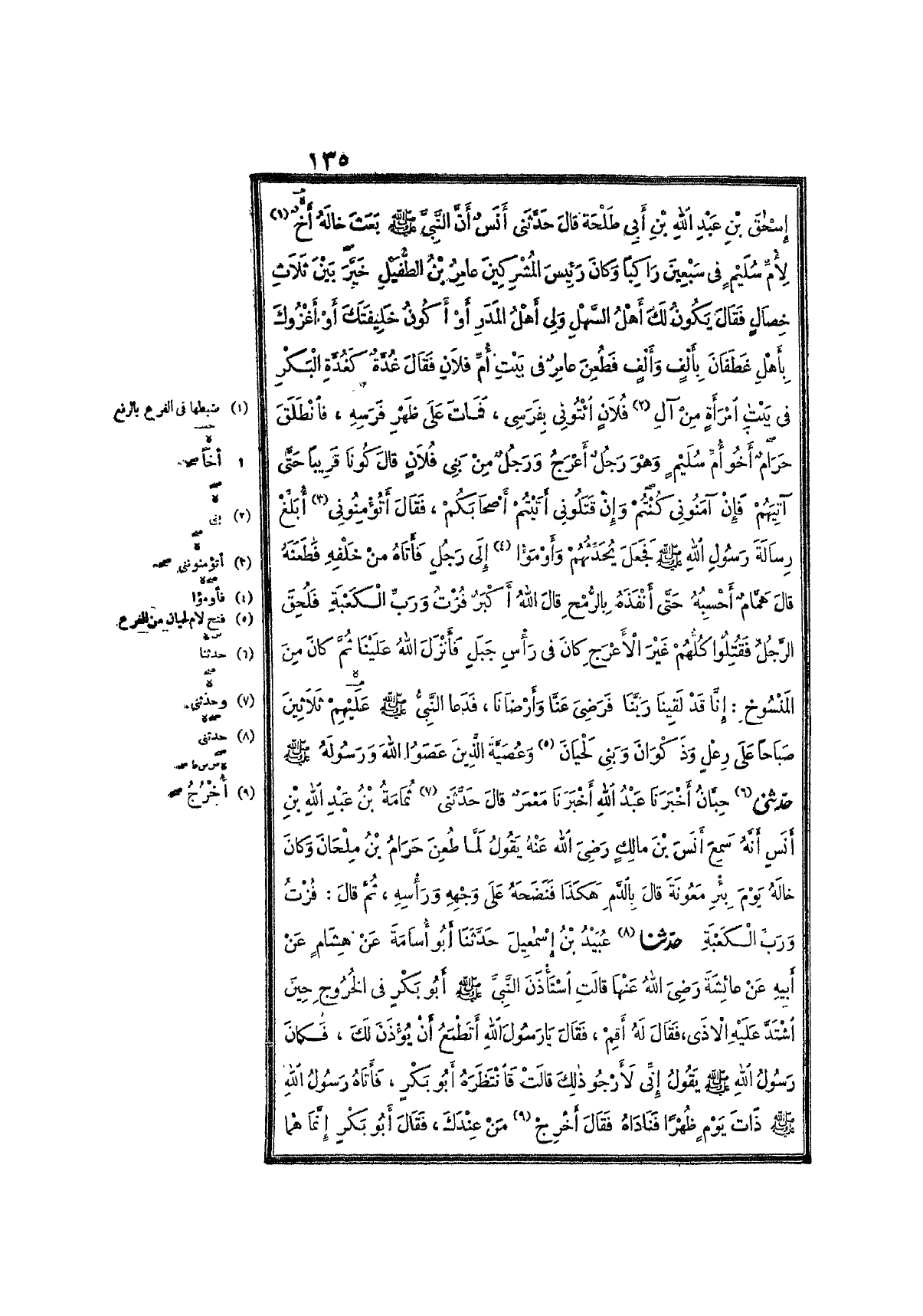 4093- حَدَّثَنَا عُبَيْدُ بْنُ إِسْمَاعِيلَ ، حَدَّثَنَا أَبُو أُسَامَةَ ، عَنْ هِشَامٍ ، عَنْ أَبِيهِ ، عَنْ عَائِشَةَ ، رَضِيَ اللَّهُ عَنْهَا ، قَالَتْ : اسْتَأْذَنَ النَّبِيَّ صَلَّى اللَّهُ عَلَيْهِ وَسَلَّمَ أَبُو بَكْرٍ فِي الخُرُوجِ حِينَ اشْتَدَّ عَلَيْهِ الأَذَى ، فَقَالَ لَهُ : أَقِمْ , فَقَالَ : يَا رَسُولَ اللهِ , أَتَطْمَعُ أَنْ يُؤْذَنَ لَكَ ؟ فَكَانَ رَسُولُ اللهِ صَلَّى اللَّهُ عَلَيْهِ وَسَلَّمَ يَقُولُ : إِنِّي لأَرْجُو ذَلِكَ , قَالَتْ : فَانْتَظَرَهُ أَبُو بَكْرٍ ، فَأَتَاهُ رَسُولُ اللهِ صَلَّى اللَّهُ عَلَيْهِ وَسَلَّمَ ذَاتَ يَوْمٍ ظُهْرًا ، فَنَادَاهُ , فَقَالَ : أَخْرِجْ مَنْ عِنْدَكَ , فَقَالَ أَبُو بَكْرٍ : إِنَّمَا هُمَا ابْنَتَايَ ، فَقَالَ : أَشَعَرْتَ أَنَّهُ قَدْ أُذِنَ لِي فِي الخُرُوجِ , فَقَالَ : يَا رَسُولَ اللهِ , الصُّحْبَةَ ، فَقَالَ النَّبِيُّ صَلَّى اللَّهُ عَلَيْهِ وَسَلَّمَ : الصُّحْبَةَ , قَالَ : يَا رَسُولَ اللهِ ، عِنْدِي نَاقَتَانِ ، قَدْ كُنْتُ أَعْدَدْتُهُمَا لِلْخُرُوجِ ، فَأَعْطَى النَّبِيَّ صَلَّى اللَّهُ عَلَيْهِ وَسَلَّمَ إِحْدَاهُمَا ، وَهِيَ الجَدْعَاءُ ، فَرَكِبَا ، فَانْطَلَقَا حَتَّى أَتَيَا الغَارَ ، وَهُوَ بِثَوْرٍ ، فَتَوَارَيَا فِيهِ ، فَكَانَ عَامِرُ بْنُ فُهَيْرَةَ غُلاَمًا لِعَبْدِ اللهِ بْنِ الطُّفَيْلِ بْنِ سَخْبَرَةَ ، أَخُو عَائِشَةَ لأُمِّهَا ،