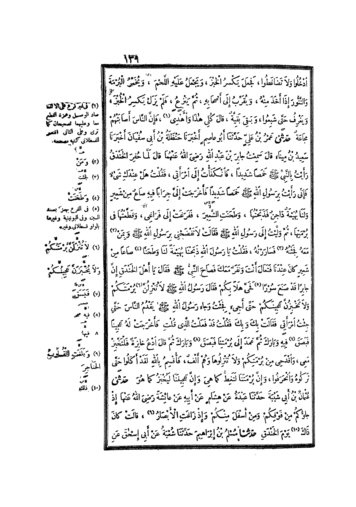 4102- حَدَّثَنِي عَمْرُو بْنُ عَلِيٍّ ، حَدَّثَنَا أَبُو عَاصِمٍ ، أَخْبَرَنَا حَنْظَلَةُ بْنُ أَبِي سُفْيَانَ ، أَخْبَرَنَا سَعِيدُ بْنُ مِينَاءَ ، قَالَ : سَمِعْتُ جَابِرَ بْنَ عَبْدِ اللهِ ، رَضِيَ اللَّهُ عَنْهُمَا , قَالَ : لَمَّا حُفِرَ الخَنْدَقُ , رَأَيْتُ بِالنَّبِيِّ صَلَّى اللَّهُ عَلَيْهِ وَسَلَّمَ خَمَصًا شَدِيدًا ، فَانْكَفَيْتُ إِلَى امْرَأَتِي ، فَقُلْتُ : هَلْ عِنْدَكِ شَيْءٌ ؟ فَإِنِّي رَأَيْتُ بِرَسُولِ اللهِ صَلَّى اللَّهُ عَلَيْهِ وَسَلَّمَ خَمَصًا شَدِيدًا ، فَأَخْرَجَتْ إِلَيَّ جِرَابًا فِيهِ صَاعٌ مِنْ شَعِيرٍ ، وَلَنَا بُهَيْمَةٌ دَاجِنٌ , فَذَبَحْتُهَا ، وَطَحَنَتِ الشَّعِيرَ ، فَفَرَغَتْ إِلَى فَرَاغِي ، وَقَطَّعْتُهَا فِي بُرْمَتِهَا ، ثُمَّ وَلَّيْتُ إِلَى رَسُولِ اللهِ صَلَّى اللَّهُ عَلَيْهِ وَسَلَّمَ ، فَقَالَتْ : لاَ تَفْضَحْنِي بِرَسُولِ اللهِ صَلَّى اللَّهُ عَلَيْهِ وَسَلَّمَ وَبِمَنْ مَعَهُ ، فَجِئْتُهُ , فَسَارَرْتُهُ ، فَقُلْتُ : يَا رَسُولَ اللهِ , ذَبَحْنَا بُهَيْمَةً لَنَا , وَطَحَنَّا صَاعًا مِنْ شَعِيرٍ كَانَ عِنْدَنَا ، فَتَعَالَ أَنْتَ وَنَفَرٌ مَعَكَ ، فَصَاحَ النَّبِيُّ صَلَّى اللَّهُ عَلَيْهِ وَسَلَّمَ : يَا أَهْلَ الخَنْدَقِ ، إِنَّ جَابِرًا قَدْ صَنَعَ سُورًا ، فَحَيَّ هَلاً بِكُمْ , فَقَالَ رَسُولُ اللهِ صَلَّى اللَّهُ عَلَيْهِ وَسَلَّمَ : لاَ تُنْزِلُنَّ بُرْمَتَكُمْ ، وَلاَ تَخْبِزُنَّ عَجِينَكُمْ حَتَّى أَجِيءَ , فَجِئْتُ , وَجَاءَ رَسُولُ اللهِ صَلَّى اللَّهُ عَلَيْهِ وَسَلَّمَ يَقْدُمُ النَّاسَ حَتَّى جِئْتُ امْرَأَتِي ، فَقَالَتْ : بِكَ وَبِكَ ، فَقُلْتُ : قَدْ فَعَلْتُ الَّذِي قُلْتِ ، فَأَخْرَجَتْ لَهُ عَجِينًا , فَبَصَقَ فِيهِ وَبَارَكَ ، ثُمَّ عَمَدَ إِلَى بُرْمَتِنَا , فَبَصَقَ وَبَارَكَ ، ثُمَّ قَالَ : ادْعُ خَابِزَةً فَلْتَخْبِزْ مَعِي ، وَاقْدَحِي مِنْ بُرْمَتِكُمْ ، وَلاَ تُنْزِلُوهَا وَهُمْ أَلْفٌ ، فَأُقْسِمُ بِاللهِ لَقَدْ أَكَلُوا حَتَّى تَرَكُوهُ وَانْحَرَفُوا ، وَإِنَّ بُرْمَتَنَا لَتَغِطُّ كَمَا هِيَ ، وَإِنَّ عَجِينَنَا لَيُخْبَزُ كَمَا هُوَ.