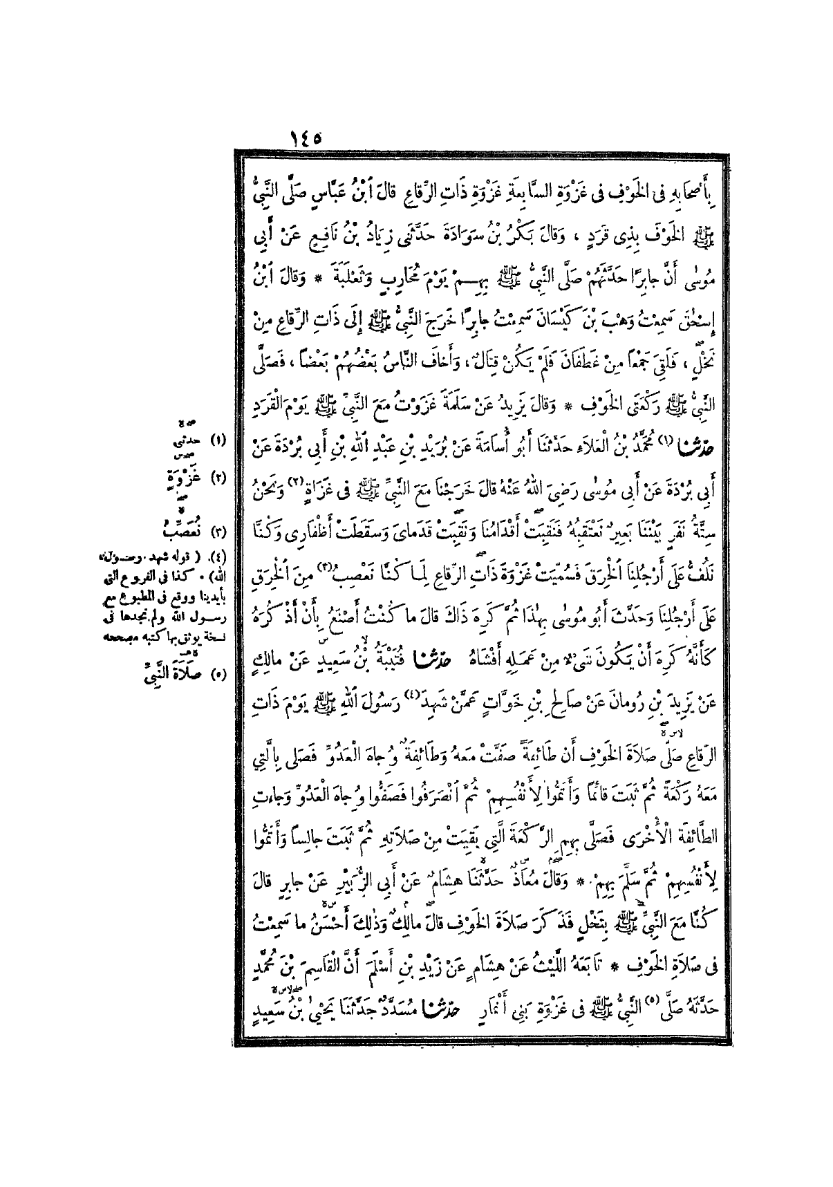 4129- حَدَّثَنَا قُتَيْبَةُ بْنُ سَعِيدٍ ، عَنْ مَالِكٍ ، عَنْ يَزِيدَ ، عَنْ صَالِحِ بْنِ خَوَّاتٍ ، عَمَّنْ شَهِدَ رَسُولَ اللهِ صَلَّى اللَّهُ عَلَيْهِ وَسَلَّمَ يَوْمَ ذَاتِ الرِّقَاعِ صَلاَةَ الخَوْفِ ؛ أَنَّ طَائِفَةً صَفَّتْ مَعَهُ ، وَطَائِفَةٌ وِجَاهَ العَدُوِّ ، فَصَلَّى بِالَّتِي مَعَهُ رَكْعَةً ، ثُمَّ ثَبَتَ قَائِمًا ، وَأَتَمُّوا لأَنْفُسِهِمْ , ثُمَّ انْصَرَفُوا ، فَصَفُّوا وِجَاهَ العَدُوِّ ، وَجَاءَتِ الطَّائِفَةُ الأُخْرَى فَصَلَّى بِهِمُ الرَّكْعَةَ الَّتِي بَقِيَتْ مِنْ صَلاَتِهِ , ثُمَّ ثَبَتَ جَالِسًا ، وَأَتَمُّوا لأَنْفُسِهِمْ ، ثُمَّ سَلَّمَ بِهِمْ.