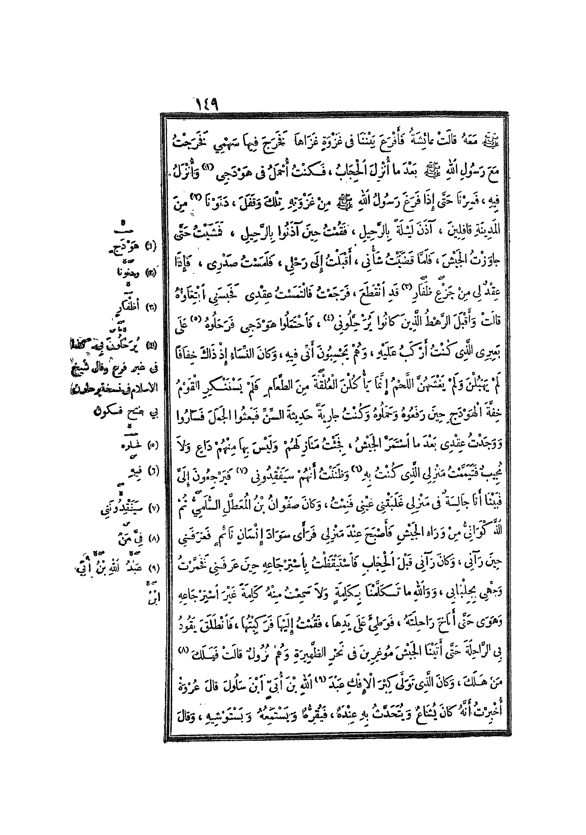 قَالَتْ : وَأَقْبَلَ الرَّهْطُ الَّذِينَ كَانُوا يُرَحِّلُونِي ، فَاحْتَمَلُوا هَوْدَجِي , فَرَحَلُوهُ عَلَى بَعِيرِي الَّذِي كُنْتُ أَرْكَبُ عَلَيْهِ ، وَهُمْ يَحْسِبُونَ أَنِّي فِيهِ ، وَكَانَ النِّسَاءُ إِذْ ذَاكَ خِفَافًا لَمْ يَهْبُلْنَ ، وَلَمْ يَغْشَهُنَّ اللَّحْمُ ، إِنَّمَا يَأْكُلْنَ العُلْقَةَ مِنَ الطَّعَامِ ، فَلَمْ يَسْتَنْكِرِ القَوْمُ خِفَّةَ الهَوْدَجِ حِينَ رَفَعُوهُ وَحَمَلُوهُ ، وَكُنْتُ جَارِيَةً حَدِيثَةَ السِّنِّ ، فَبَعَثُوا الجَمَلَ , فَسَارُوا ، وَوَجَدْتُ عِقْدِي بَعْدَ مَا اسْتَمَرَّ الجَيْشُ ، فَجِئْتُ مَنَازِلَهُمْ وَلَيْسَ بِهَا مِنْهُمْ دَاعٍ ، وَلاَ مُجِيبٌ ، فَتَيَمَّمْتُ مَنْزِلِي الَّذِي كُنْتُ بِهِ ، وَظَنَنْتُ أَنَّهُمْ سَيَفْقِدُونِي فَيَرْجِعُونَ إِلَيَّ ، فَبَيْنَا أَنَا جَالِسَةٌ فِي مَنْزِلِي ، غَلَبَتْنِي عَيْنِي فَنِمْتُ ، وَكَانَ صَفْوَانُ بْنُ المُعَطَّلِ السُّلَمِيُّ ثُمَّ الذَّكْوَانِيُّ مِنْ وَرَاءِ الجَيْشِ ، فَأَصْبَحَ عِنْدَ مَنْزِلِي ، فَرَأَى سَوَادَ إِنْسَانٍ نَائِمٍ , فَعَرَفَنِي حِينَ رَآنِي ، وَكَانَ رَآنِي قَبْلَ الحِجَابِ ، فَاسْتَيْقَظْتُ بِاسْتِرْجَاعِهِ حِينَ عَرَفَنِي ، فَخَمَّرْتُ وَجْهِي بِجِلْبَابِي ، وَوَاللهِ مَا تَكَلَّمْنَا بِكَلِمَةٍ ، وَلاَ سَمِعْتُ مِنْهُ كَلِمَةً غَيْرَ اسْتِرْجَاعِهِ ، وَهَوَى حَتَّى , أَنَاخَ رَاحِلَتَهُ ، فَوَطِئَ عَلَى يَدِهَا ، فَقُمْتُ إِلَيْهَا فَرَكِبْتُهَا ، فَانْطَلَقَ يَقُودُ بِي الرَّاحِلَةَ حَتَّى أَتَيْنَا الجَيْشَ مُوغِرِينَ فِي نَحْرِ الظَّهِيرَةِ وَهُمْ نُزُولٌ ، قَالَتْ : فَهَلَكَ مَنْ هَلَكَ ، وَكَانَ الَّذِي تَوَلَّى كِبْرَ الإِفْكِ عَبْدُ اللهِ بْنُ أُبَيٍّ ابْنُ سَلُولَ ، قَالَ عُرْوَةُ : أُخْبِرْتُ أَنَّهُ كَانَ يُشَاعُ وَيُتَحَدَّثُ بِهِ عِنْدَهُ ، فَيُقِرُّهُ وَيَسْتَمِعُهُ وَيَسْتَوْشِيهِ ، وَقَالَ عُرْوَةُ أَيْضًا : لَمْ يُسَمَّ مِنْ أَهْلِ الإِفْكِ أَيْضًا إِلاَّ حَسَّانُ بْنُ ثَابِتٍ ، وَمِسْطَحُ بْنُ أُثَاثَةَ ، وَحَمْنَةُ بِنْتُ جَحْشٍ ، فِي نَاسٍ آخَرِينَ لاَ عِلْمَ لِي بِهِمْ ، غَيْرَ أَنَّهُمْ عُصْبَةٌ ، كَمَا قَالَ اللَّهُ تَعَالَى ، وَإِنَّ كِبْرَ ذَلِكَ يُقَالُ لَهُ : عَبْدُ اللهِ بْنُ أُبَيٍّ ابْنُ سَلُولَ ، قَالَ عُرْوَةُ : كَانَتْ عَائِشَةُ تَكْرَهُ أَنْ يُسَبَّ عِنْدَهَا حَسَّانُ ، وَتَقُولُ : إِنَّهُ الَّذِي قَالَ :