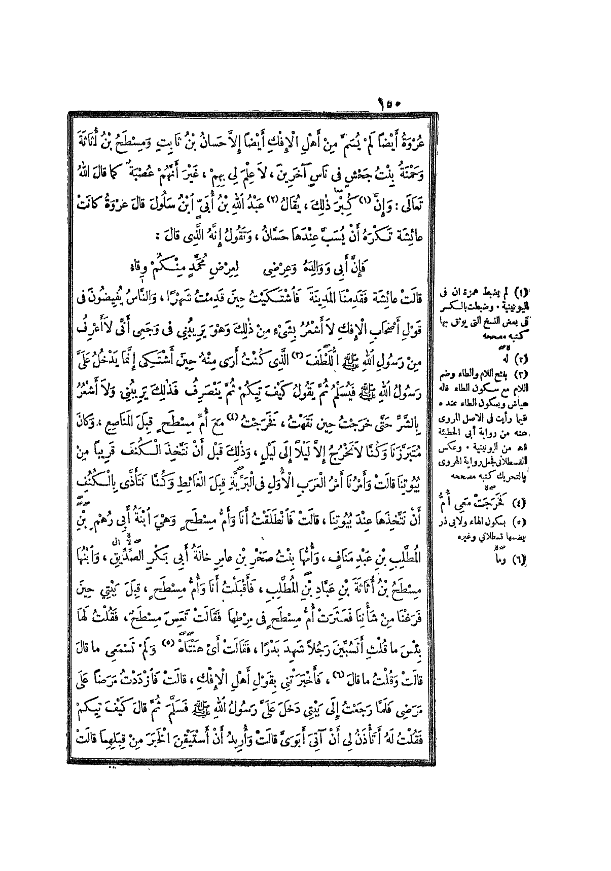 قَالَتْ عَائِشَةُ : فَقَدِمْنَا المَدِينَةَ ، فَاشْتَكَيْتُ حِينَ قَدِمْتُ شَهْرًا ، وَالنَّاسُ يُفِيضُونَ فِي قَوْلِ أَصْحَابِ الإِفْكِ ، لاَ أَشْعُرُ بِشَيْءٍ مِنْ ذَلِكَ ، وَهُوَ يَرِيبُنِي فِي وَجَعِي أَنِّي لاَ أَعْرِفُ مِنْ رَسُولِ اللهِ صَلَّى اللَّهُ عَلَيْهِ وَسَلَّمَ اللُّطْفَ الَّذِي كُنْتُ أَرَى مِنْهُ حِينَ أَشْتَكِي ، إِنَّمَا يَدْخُلُ عَلَيَّ رَسُولُ اللهِ صَلَّى اللَّهُ عَلَيْهِ وَسَلَّمَ فَيُسَلِّمُ , ثُمَّ يَقُولُ : كَيْفَ تِيكُمْ ، ثُمَّ يَنْصَرِفُ ، فَذَلِكَ يَرِيبُنِي ، وَلاَ أَشْعُرُ بِالشَّرِّ ، حَتَّى خَرَجْتُ حِينَ نَقَهْتُ ، فَخَرَجْتُ مَعَ أُمِّ مِسْطَحٍ قِبَلَ المَنَاصِعِ ، وَكَانَ مُتَبَرَّزَنَا ، وَكُنَّا لاَ نَخْرُجُ إِلاَّ لَيْلاً إِلَى لَيْلٍ ، وَذَلِكَ قَبْلَ أَنْ نَتَّخِذَ الكُنُفَ قَرِيبًا مِنْ بُيُوتِنَا ، قَالَتْ : وَأَمْرُنَا أَمْرُ العَرَبِ الأُوَلِ فِي البَرِّيَّةِ قِبَلَ الغَائِطِ ، وَكُنَّا نَتَأَذَّى بِالكُنُفِ أَنْ نَتَّخِذَهَا عِنْدَ بُيُوتِنَا ، قَالَتْ : فَانْطَلَقْتُ أَنَا وَأُمُّ مِسْطَحٍ ، وَهِيَ ابْنَةُ أَبِي رُهْمِ بْنِ المُطَّلِبِ بْنِ عَبْدِ مَنَافٍ ، وَأُمُّهَا بِنْتُ صَخْرِ بْنِ عَامِرٍ ، خَالَةُ أَبِي بَكْرٍ الصِّدِّيقِ ، وَابْنُهَا مِسْطَحُ بْنُ أُثَاثَةَ بْنِ عَبَّادِ بْنِ المُطَّلِبِ ، فَأَقْبَلْتُ أَنَا وَأُمُّ مِسْطَحٍ قِبَلَ بَيْتِي حِينَ فَرَغْنَا مِنْ شَأْنِنَا ، فَعَثَرَتْ أُمُّ مِسْطَحٍ فِي مِرْطِهَا , فَقَالَتْ : تَعِسَ مِسْطَحٌ ، فَقُلْتُ لَهَا : بِئْسَ مَا قُلْتِ ، أَتَسُبِّينَ رَجُلاً شَهِدَ بَدْرًا ؟ فَقَالَتْ : أَيْ هَنْتَاهْ وَلَمْ تَسْمَعِي مَا قَالَ ؟ قَالَتْ : وَقُلْتُ : مَا قَالَ ؟ فَأَخْبَرَتْنِي بِقَوْلِ أَهْلِ الإِفْكِ ، قَالَتْ : فَازْدَدْتُ مَرَضًا عَلَى مَرَضِي ، فَلَمَّا رَجَعْتُ إِلَى بَيْتِي , دَخَلَ عَلَيَّ رَسُولُ اللهِ صَلَّى اللَّهُ عَلَيْهِ وَسَلَّمَ فَسَلَّمَ ، ثُمَّ قَالَ : كَيْفَ تِيكُمْ ؟ فَقُلْتُ لَهُ : أَتَأْذَنُ لِي أَنْ آتِيَ أَبَوَيَّ ؟ قَالَتْ : وَأُرِيدُ أَنْ أَسْتَيْقِنَ الخَبَرَ مِنْ قِبَلِهِمَا ، قَالَتْ : فَأَذِنَ لِي رَسُولُ اللهِ صَلَّى اللَّهُ عَلَيْهِ وَسَلَّمَ ، فَقُلْتُ لأُمِّي : يَا أُمَّتَاهُ ، مَاذَا يَتَحَدَّثُ النَّاسُ ؟ قَالَتْ : يَا بُنَيَّةُ ، هَوِّنِي عَلَيْكِ ، فَوَاللهِ لَقَلَّمَا كَانَتِ امْرَأَةٌ قَطُّ وَضِيئَةً عِنْدَ رَجُلٍ يُحِبُّهَا ، لَهَا ضَرَائِرُ ، إِلاَّ أَكْثَرْنَ عَلَيْهَا ، قَالَتْ : فَقُلْتُ : سُبْحَانَ اللهِ ، أَوَلَقَدْ تَحَدَّثَ النَّاسُ بِهَذَا ؟ قَالَتْ : فَبَكَيْتُ تِلْكَ اللَّيْلَةَ , حَتَّى أَصْبَحْتُ لاَ يَرْقَأُ لِي دَمْعٌ ، وَلاَ أَكْتَحِلُ بِنَوْمٍ ، ثُمَّ أَصْبَحْتُ أَبْكِي ،